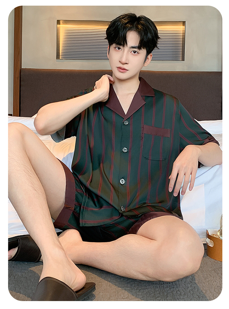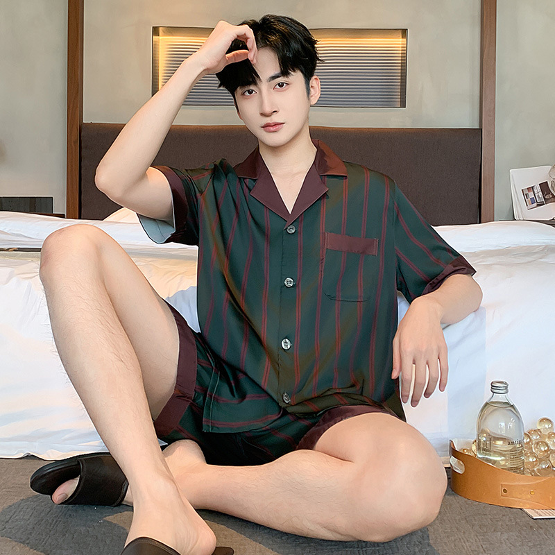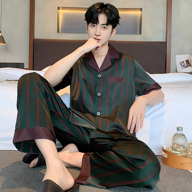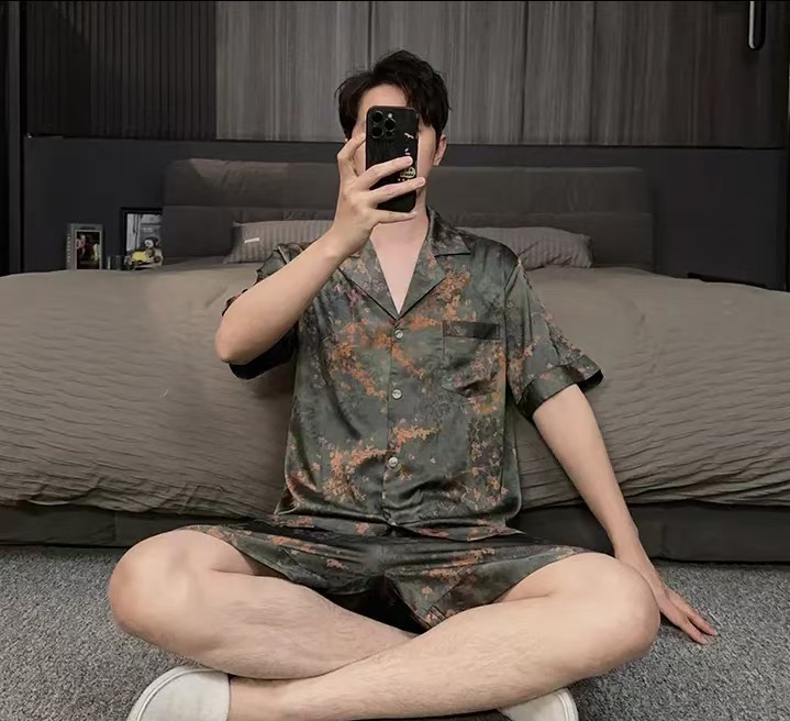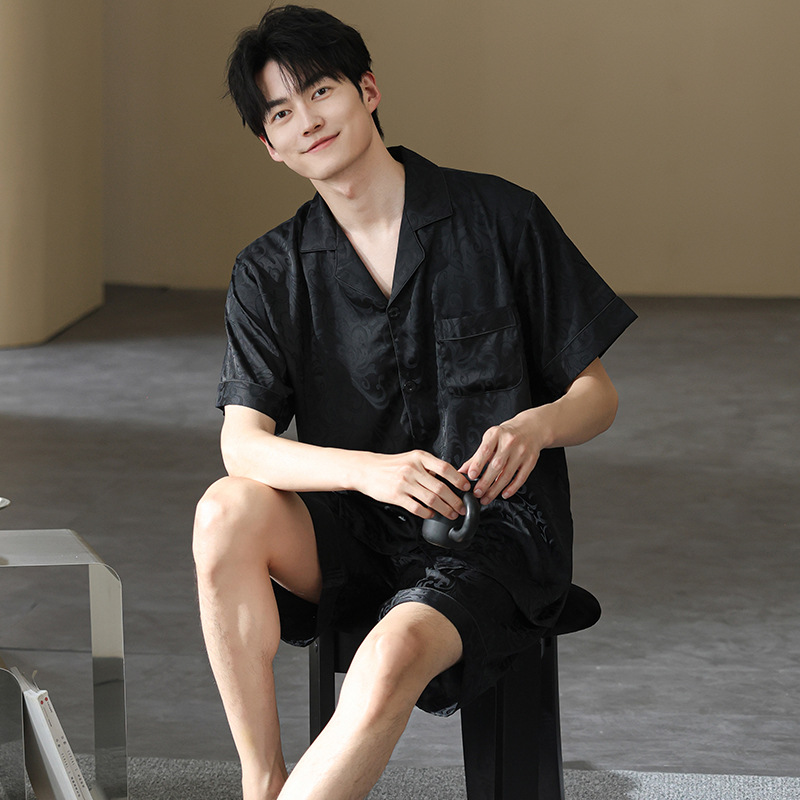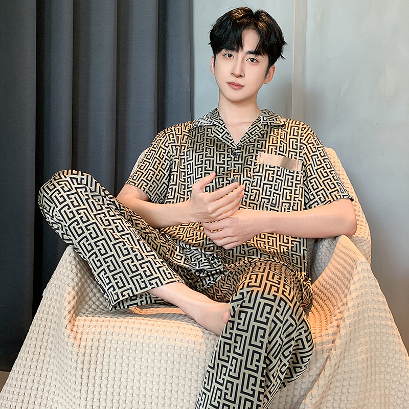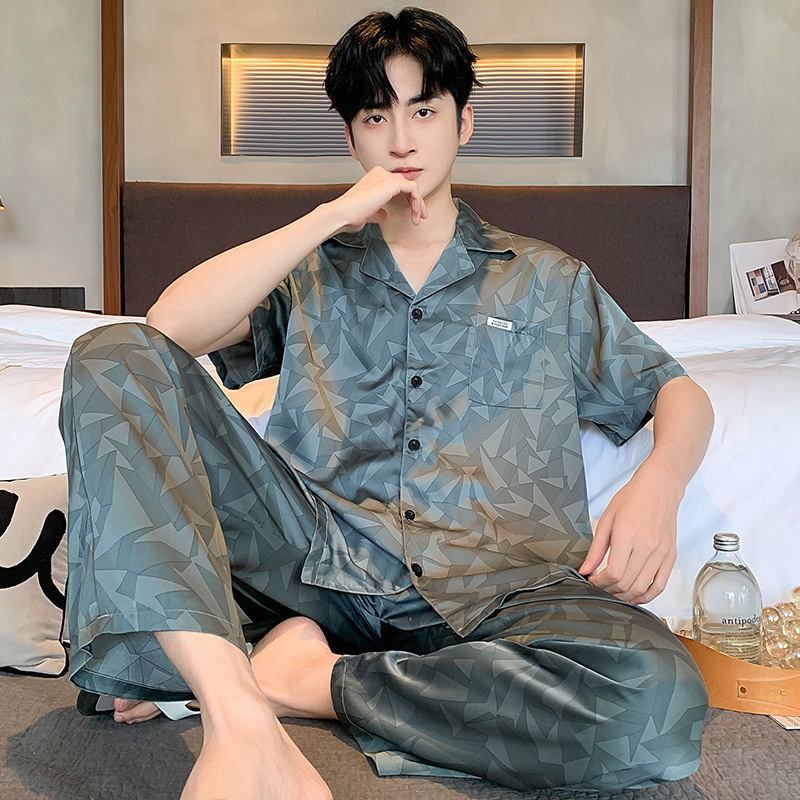 새로운 도착 얼음 실크 잠옷 남자 얇은 반팔 옷깃 여름 십대 플러스 사이즈 105kg 착용 가능한 홈웨어 세트