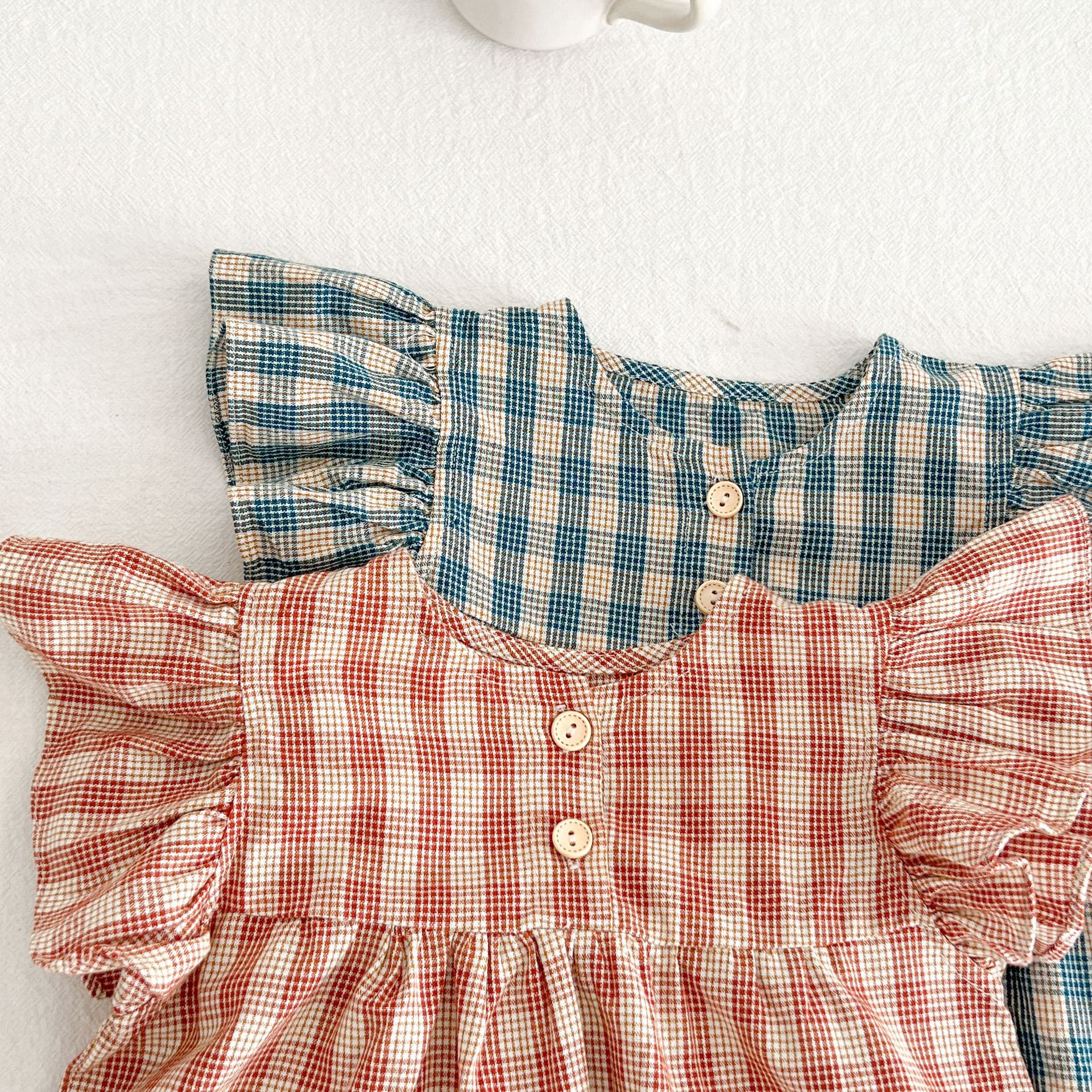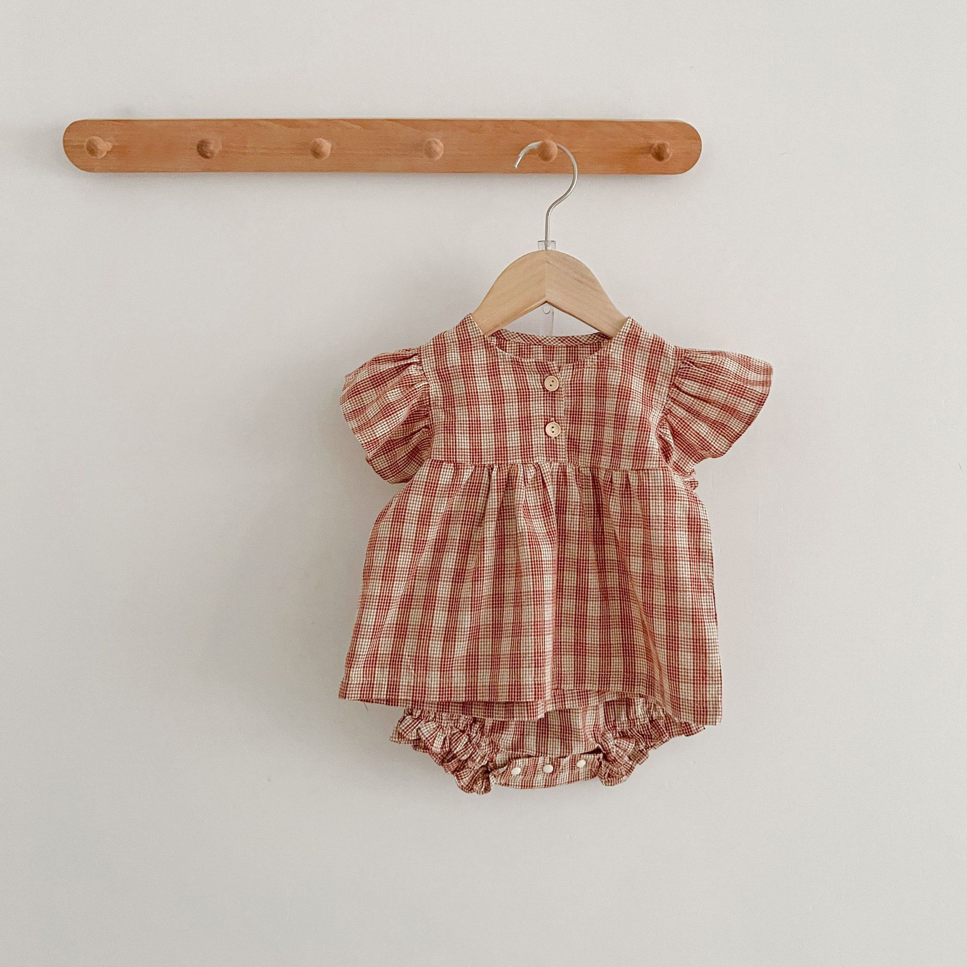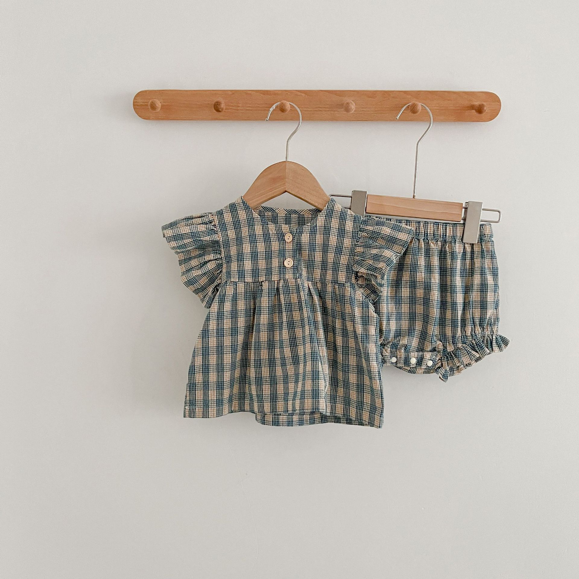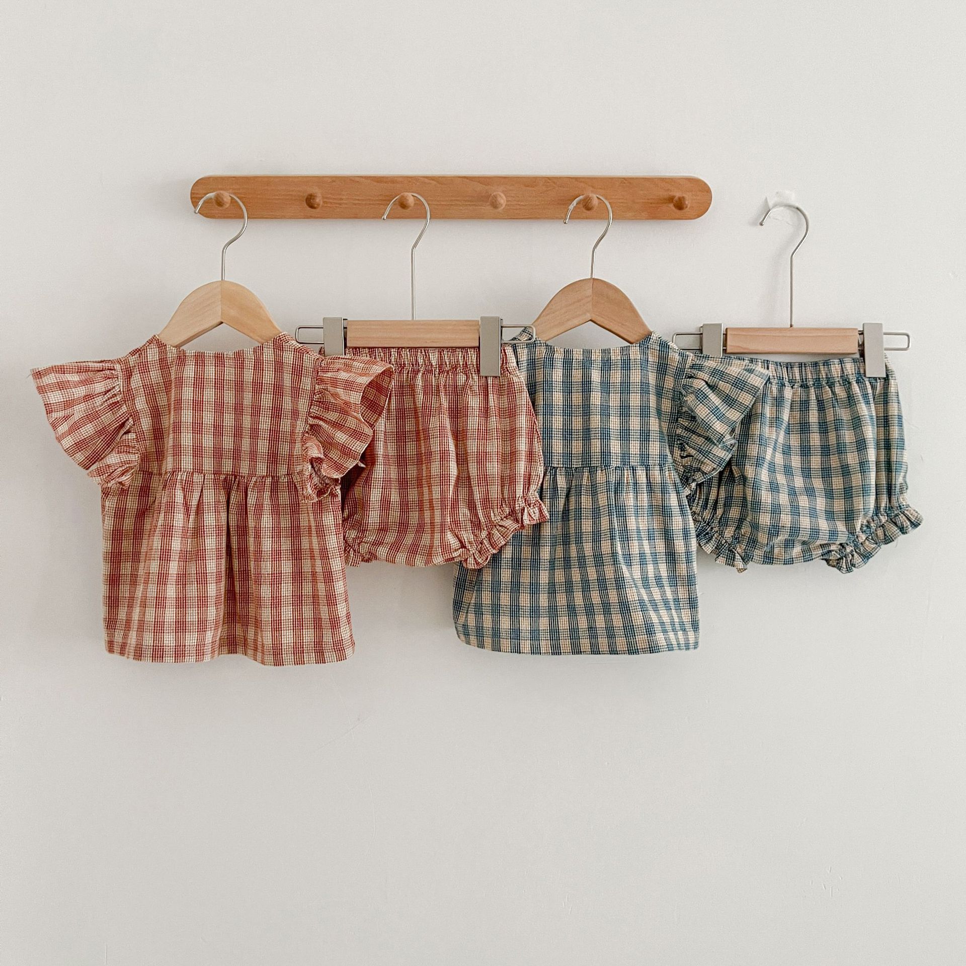 아기 여름 새로운 비행 소매 격자 무늬 인형 셔츠 반바지 세트 아기 소녀 스타일리스트 탑 + 가방 방귀 투피스 세트스토어 가기