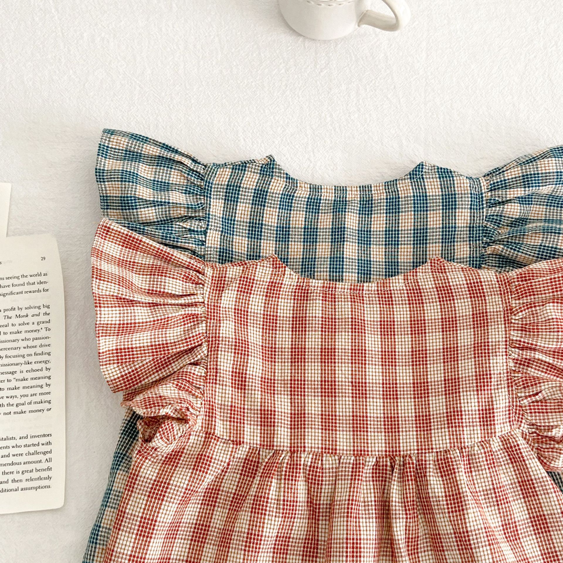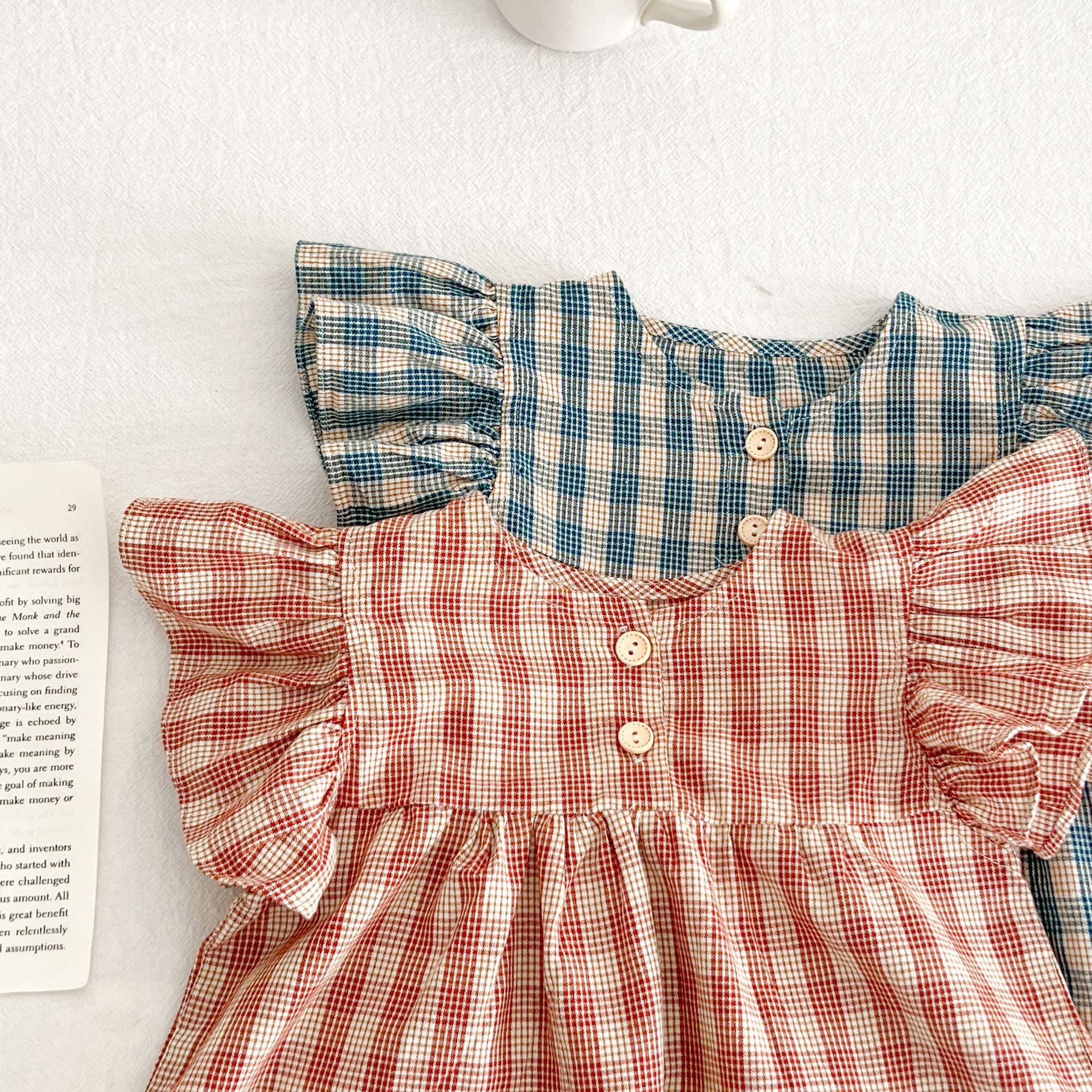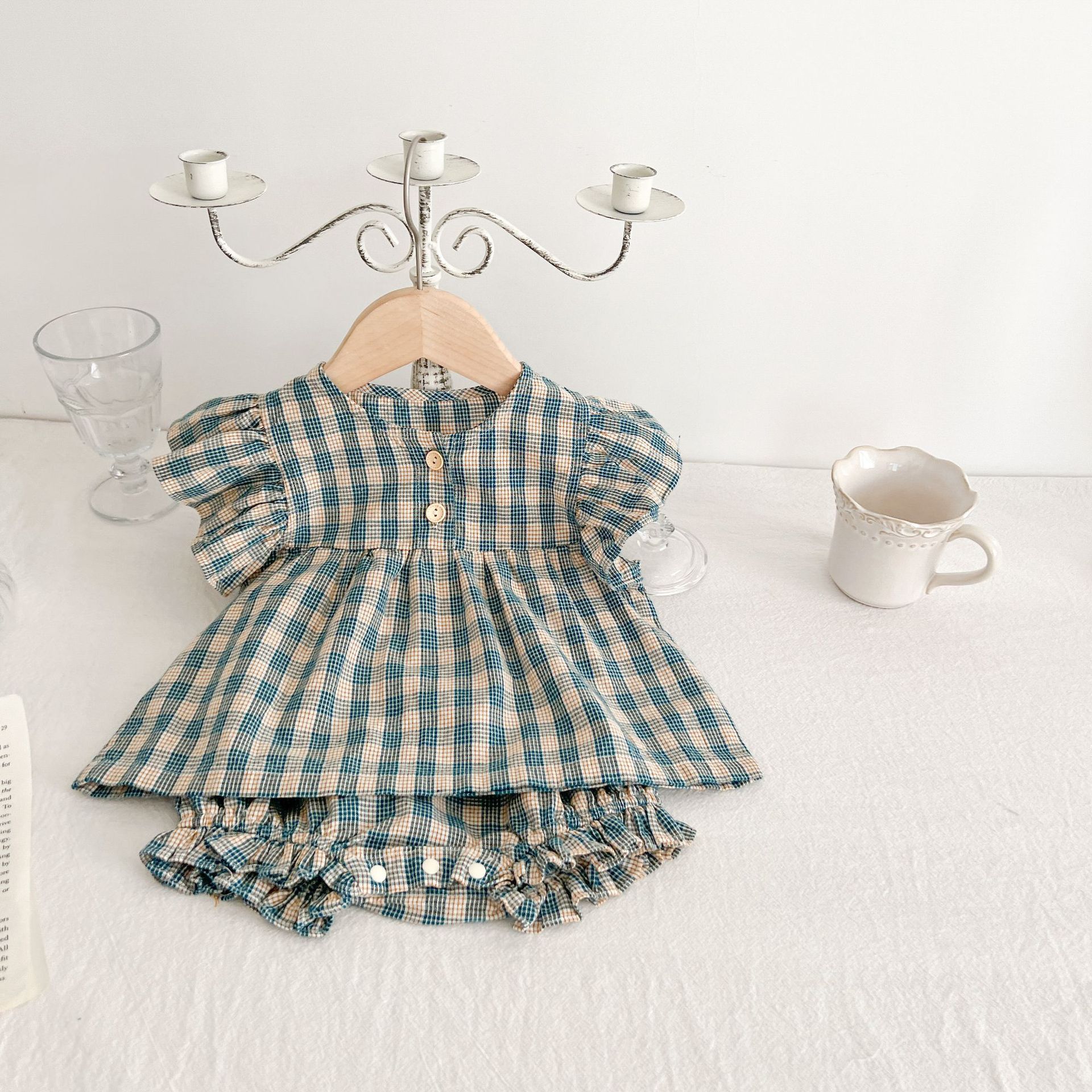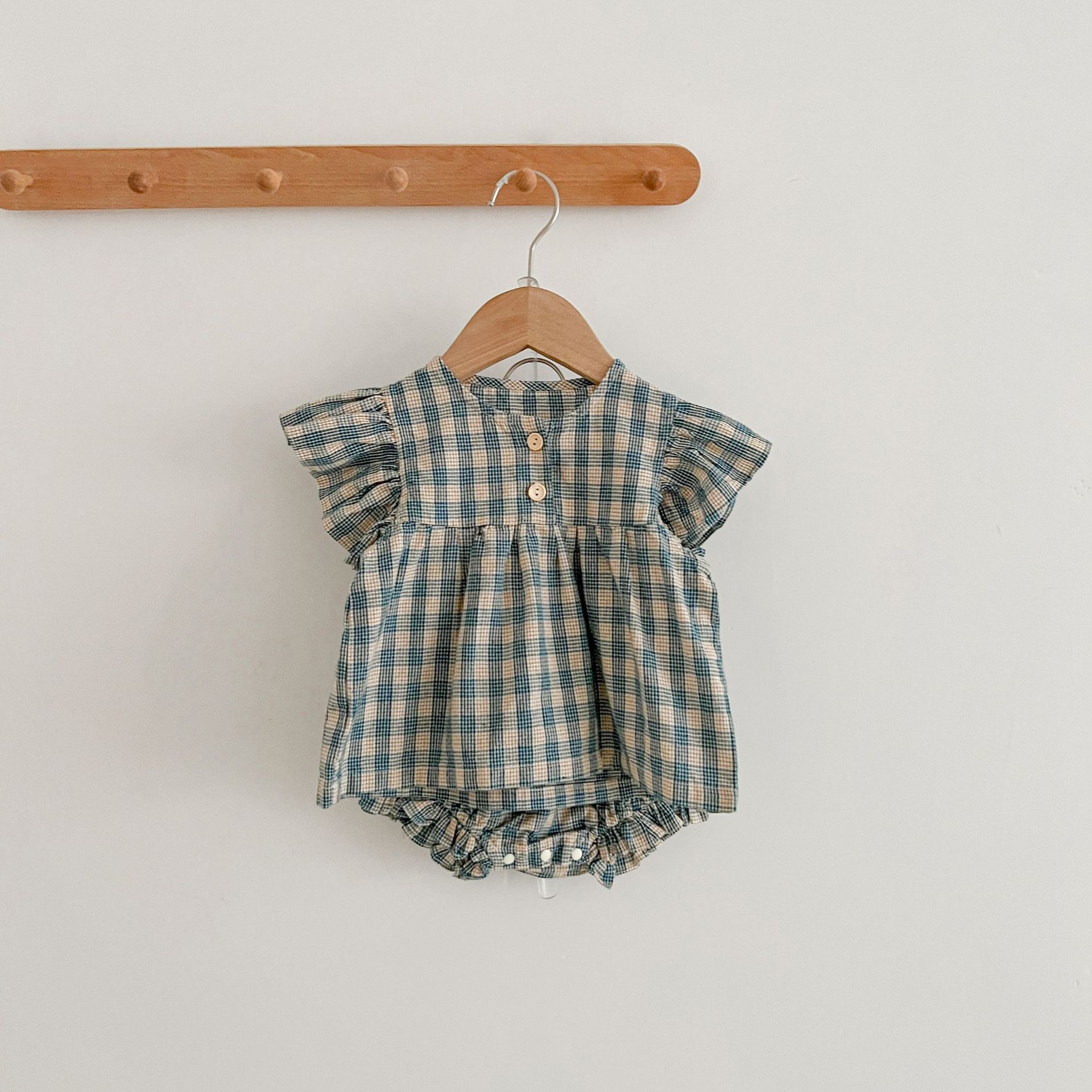 아기 여름 새로운 비행 소매 격자 무늬 인형 셔츠 반바지 세트 아기 소녀 스타일리스트 탑 + 가방 방귀 투피스 세트스토어 가기