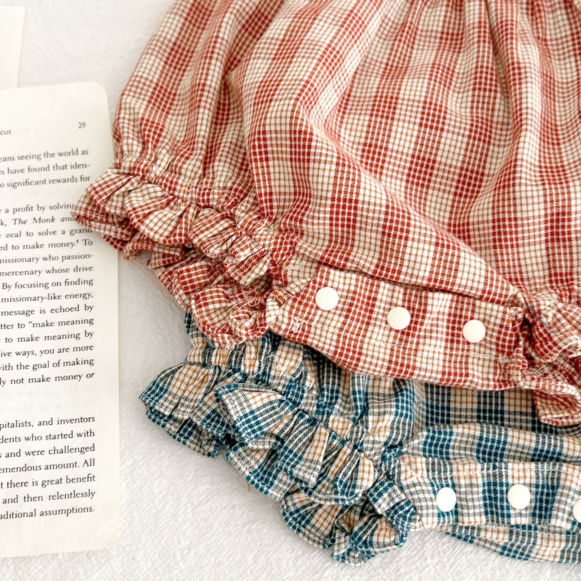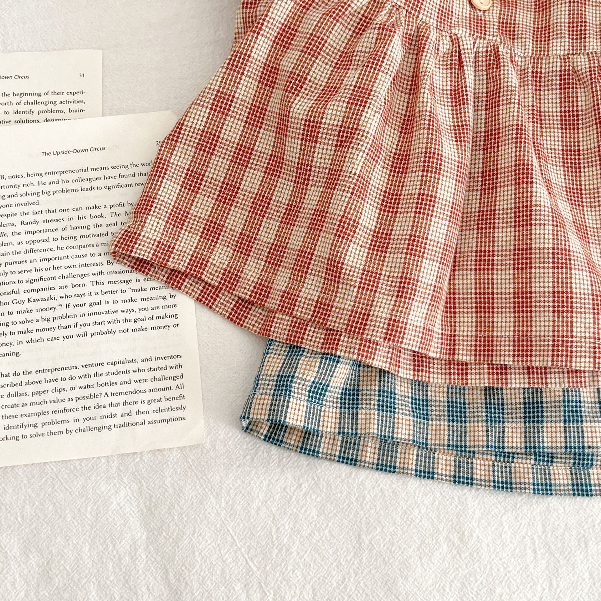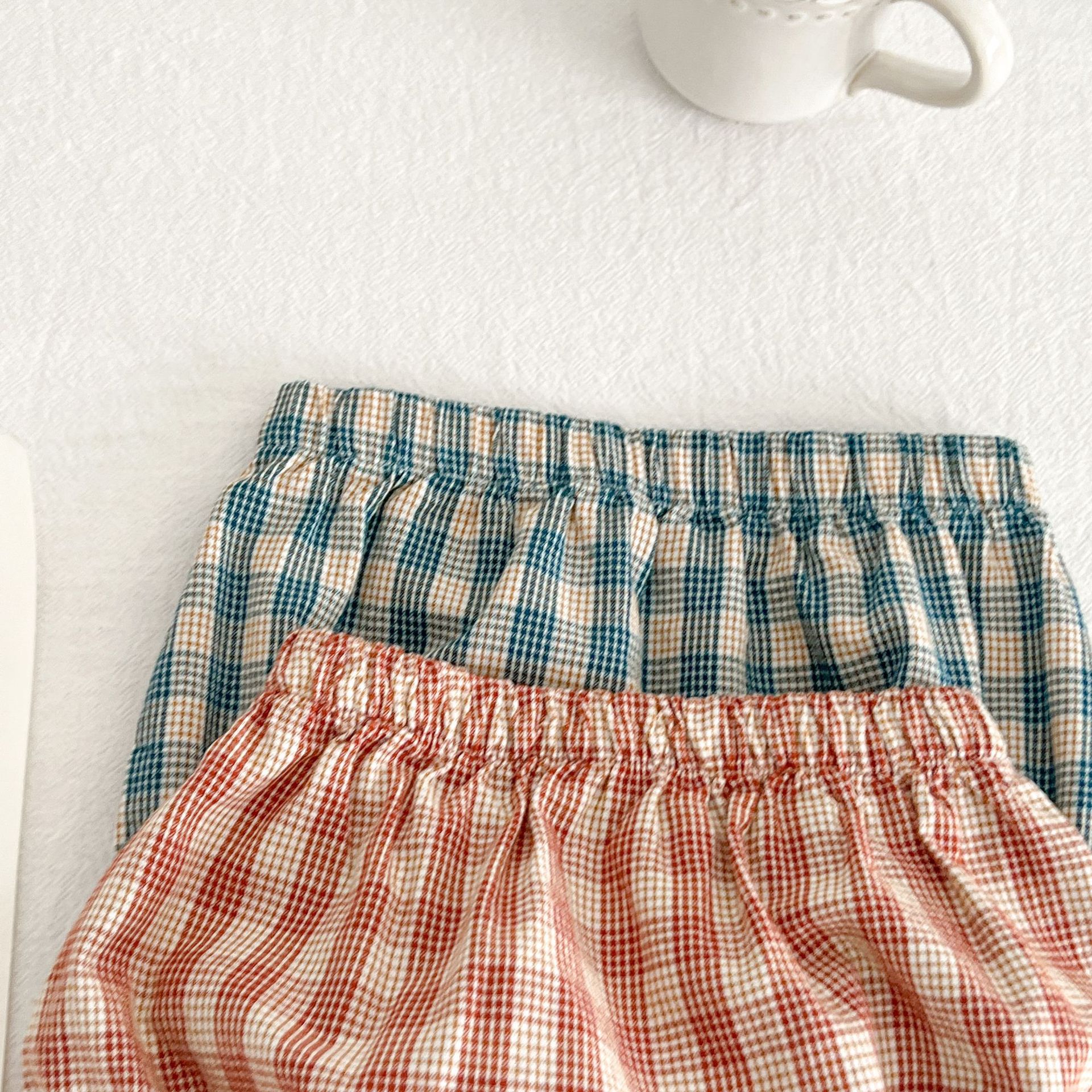 아기 여름 새로운 비행 소매 격자 무늬 인형 셔츠 반바지 세트 아기 소녀 스타일리스트 탑 + 가방 방귀 투피스 세트