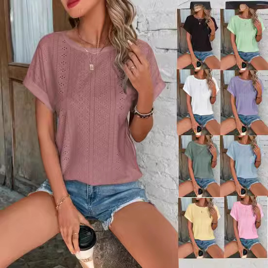 2023 여름 새로운 크로스 보더 유럽과 미국 여성의 최고 중공 메쉬 자수 박쥐 슬리브 캐주얼스토어 가기