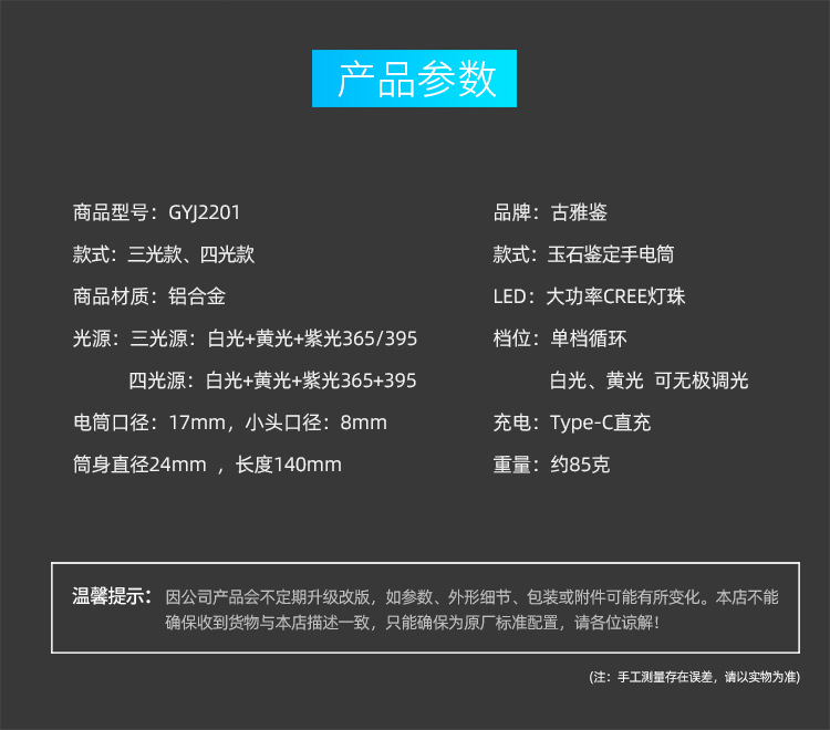• 배터리 포함 실버-3 개의 광원 [화이트 + 옐로우 + 퍼플 라이트 365] 무단 디밍 (컬러 박스 + 충전 라인 + 콘덴서 헤드)