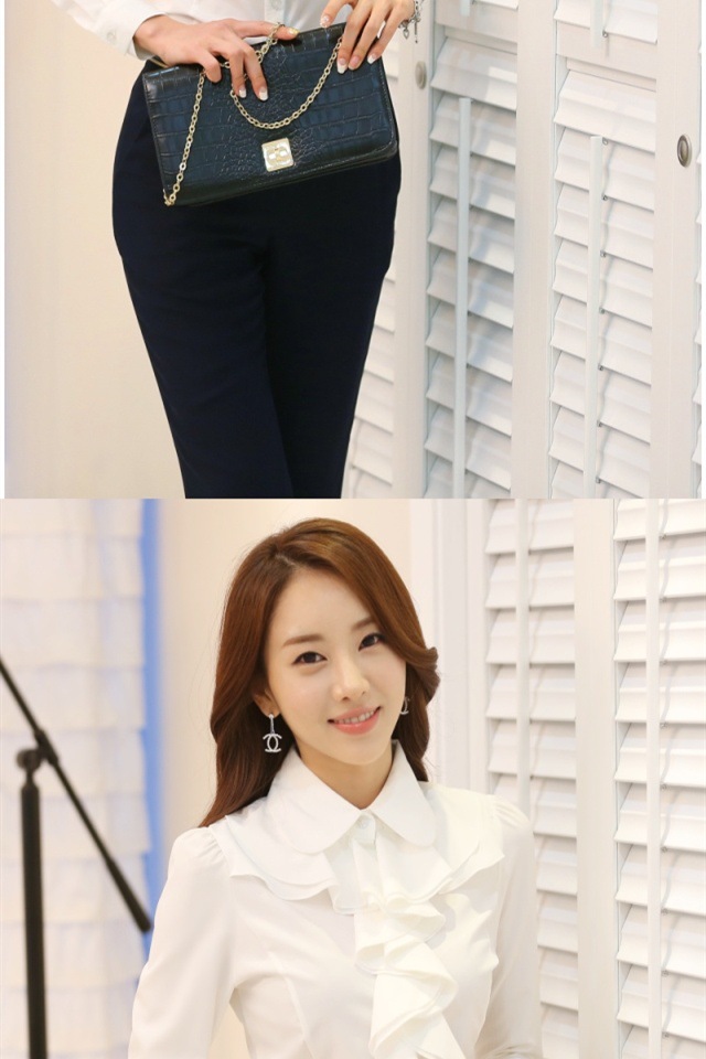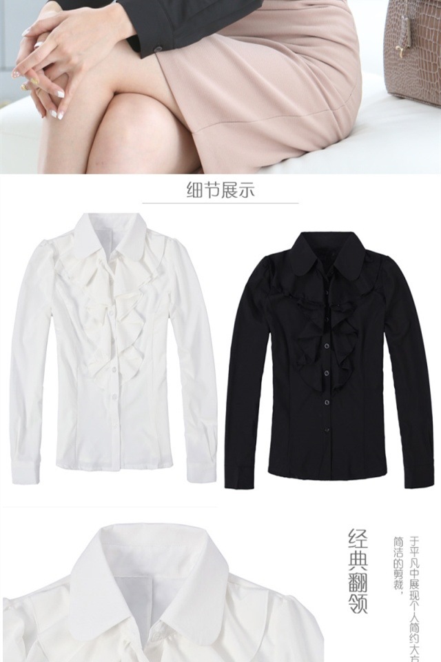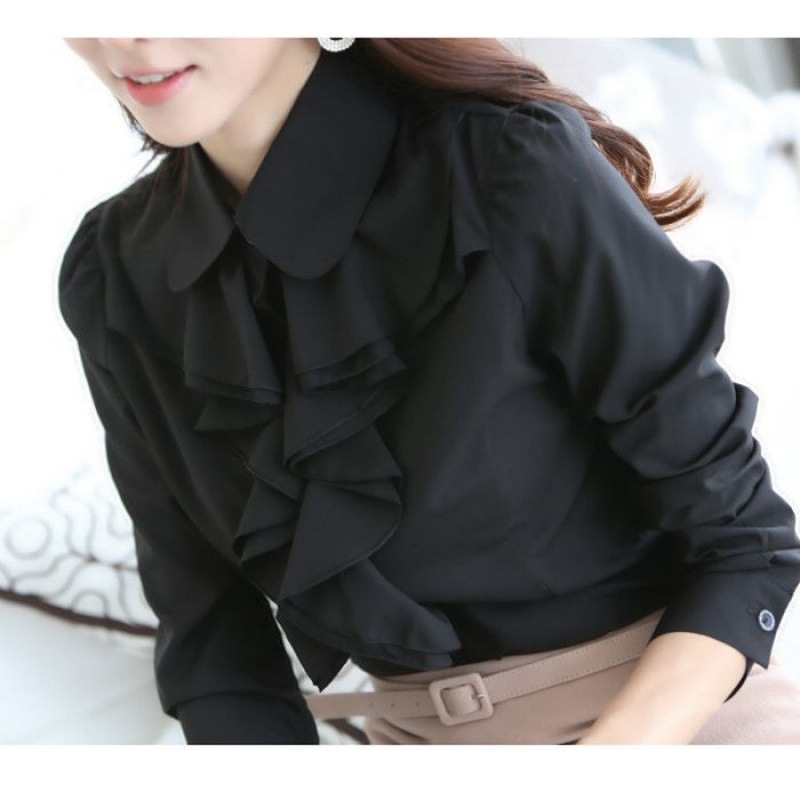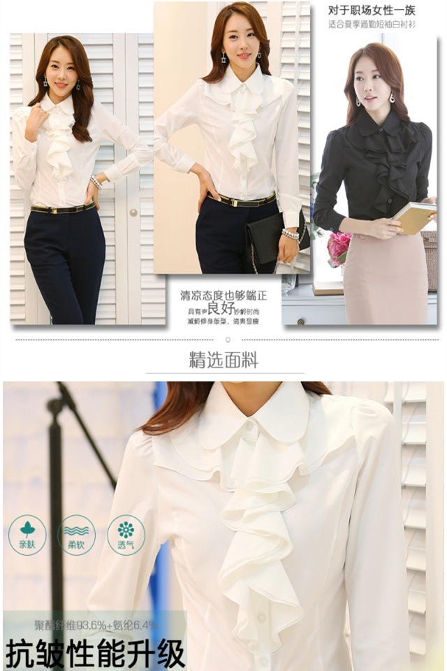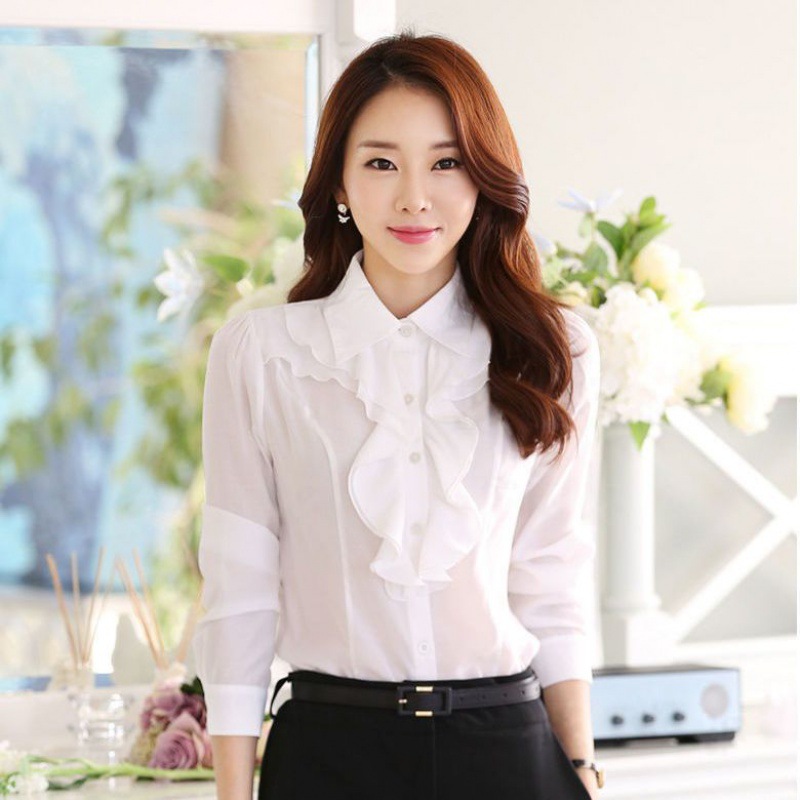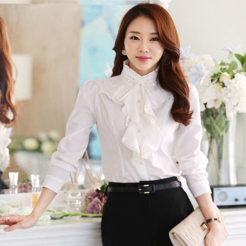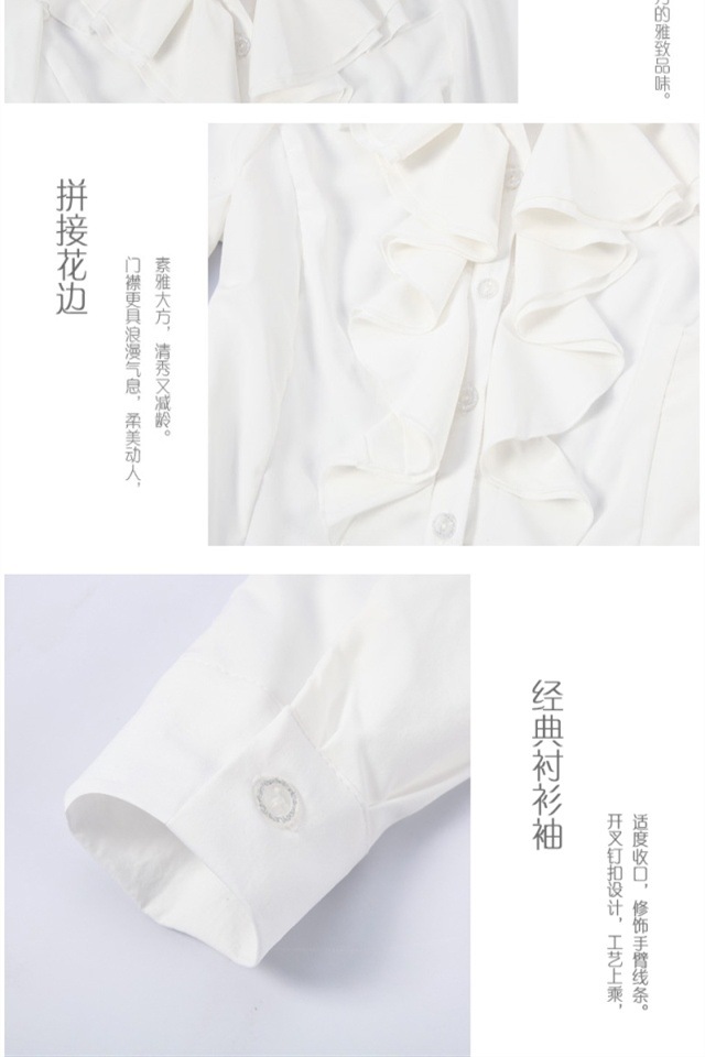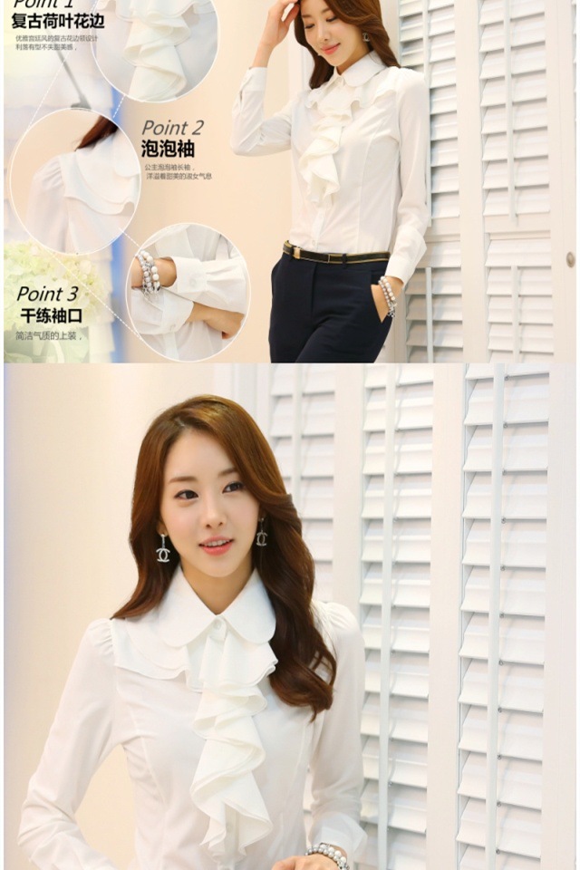 한국식 통근 라펠 프릴 레이스 화이트 셔츠 여성용 긴팔 비즈니스웨어 슬림핏 쉬폰 탑스토어 가기