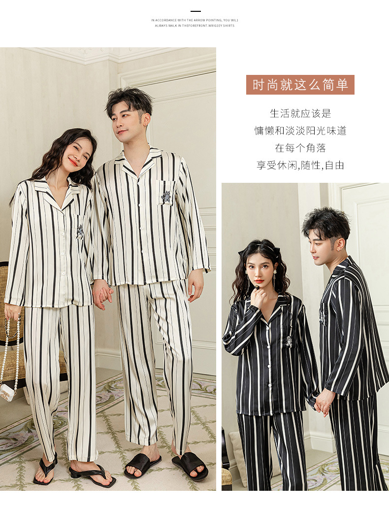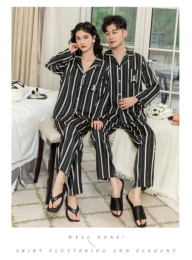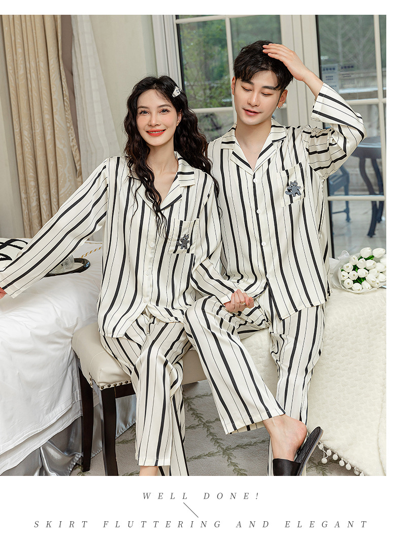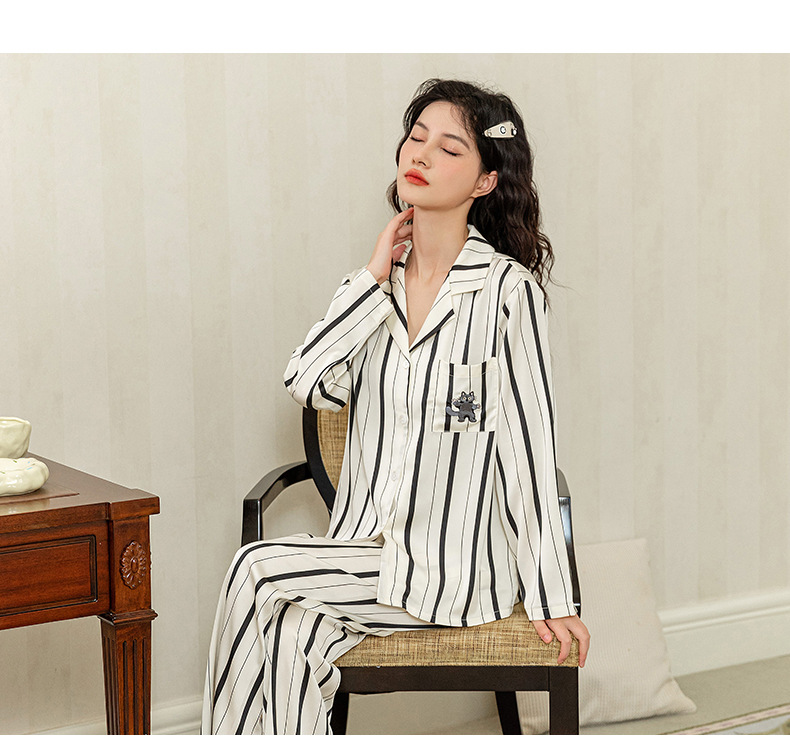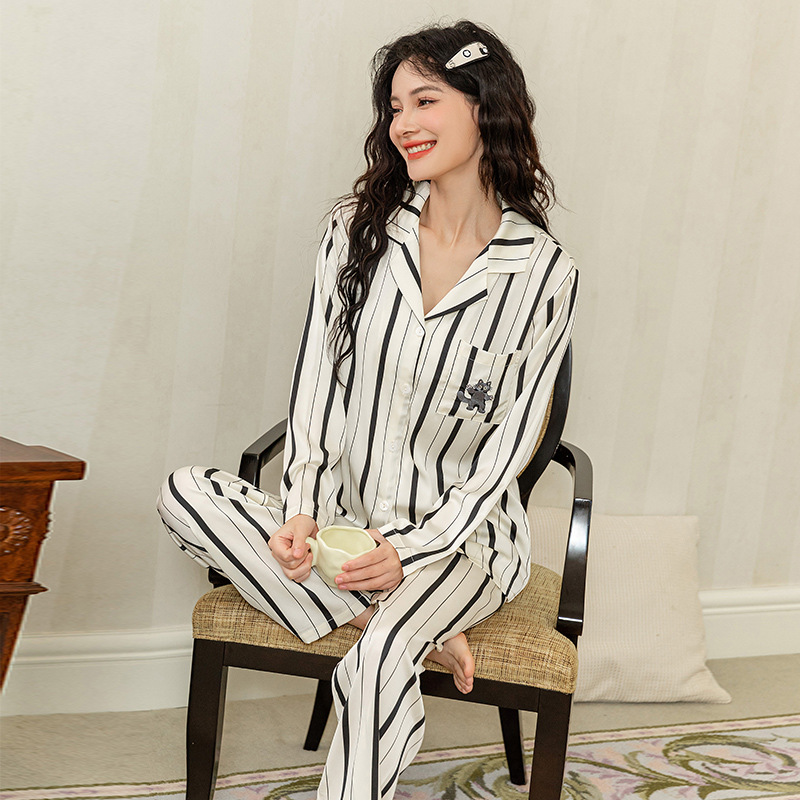 아이스 실크 스트라이프 럭키 고양이 긴 소매 커플 잠옷 여성용 TikTok 같은 스타일 봄과 여름 남성용 얇은 가정복