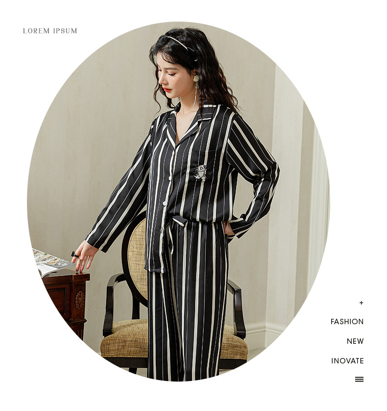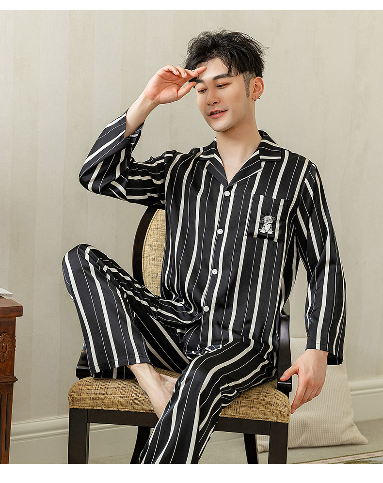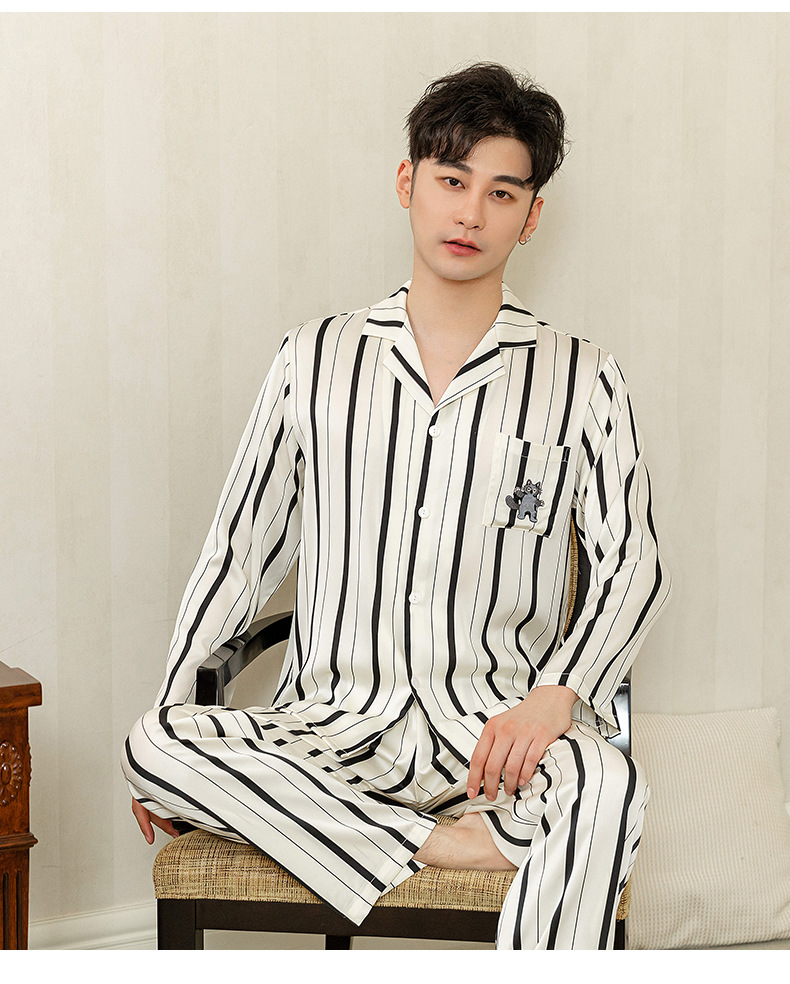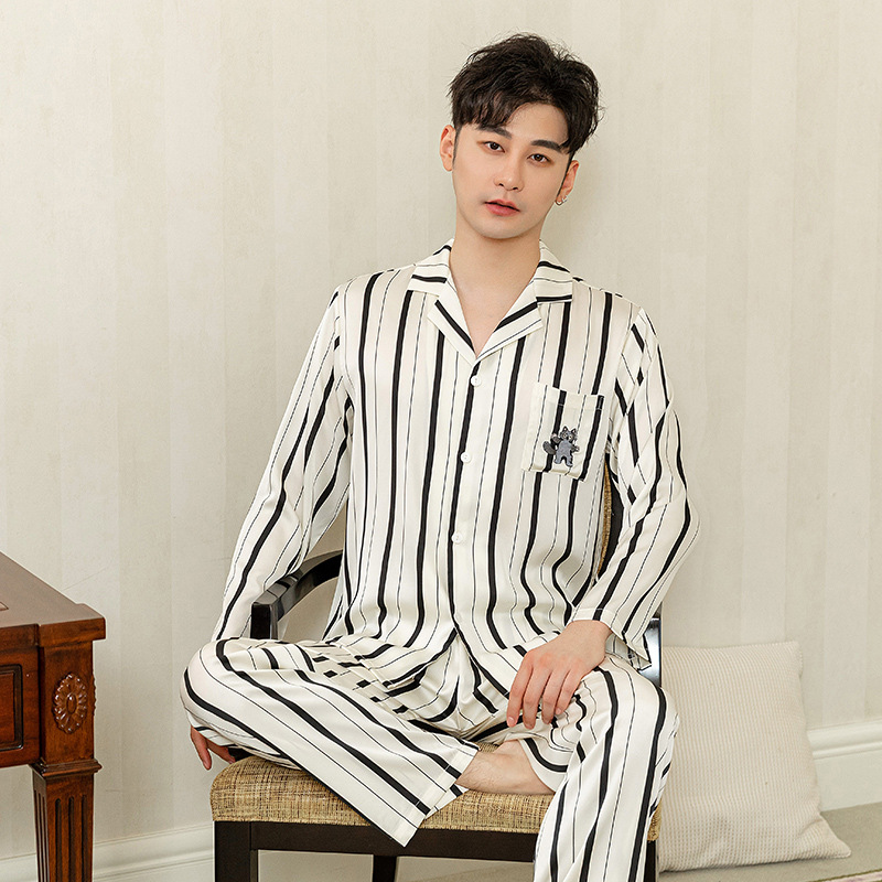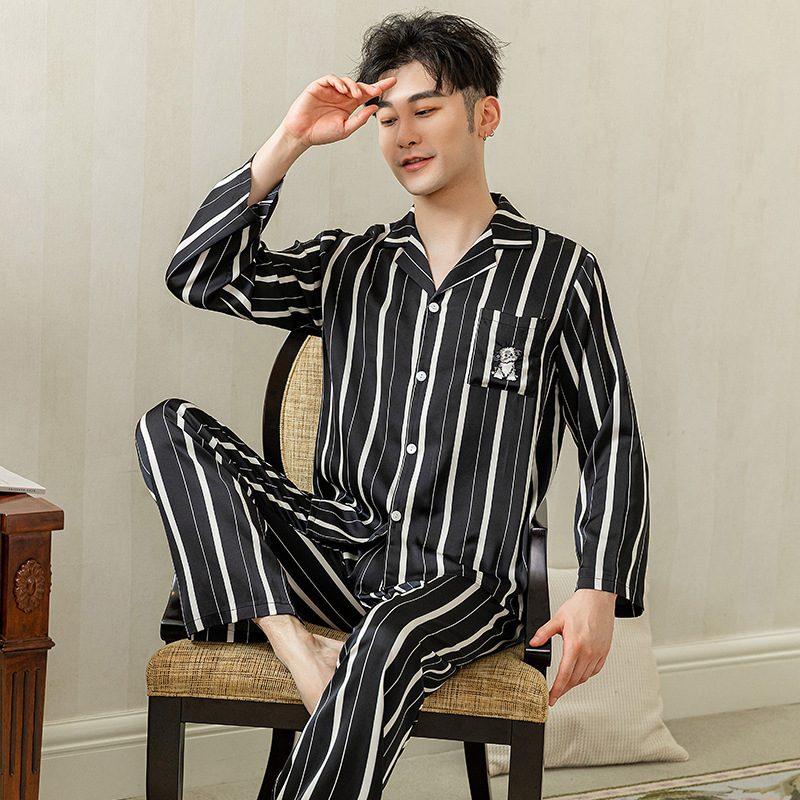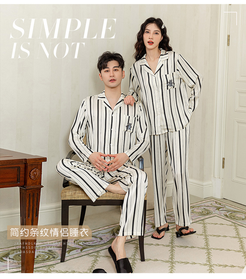 아이스 실크 스트라이프 럭키 고양이 긴 소매 커플 잠옷 여성용 TikTok 같은 스타일 봄과 여름 남성용 얇은 가정복