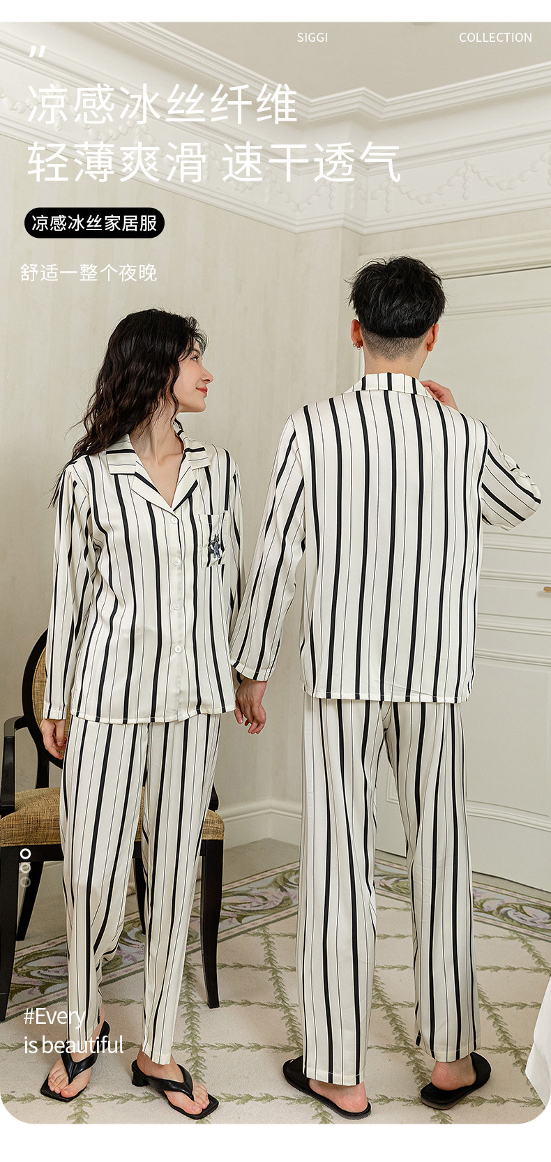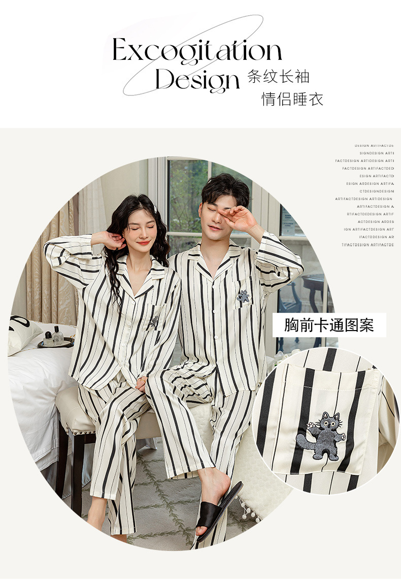 아이스 실크 스트라이프 럭키 고양이 긴 소매 커플 잠옷 여성용 TikTok 같은 스타일 봄과 여름 남성용 얇은 가정복스토어 가기