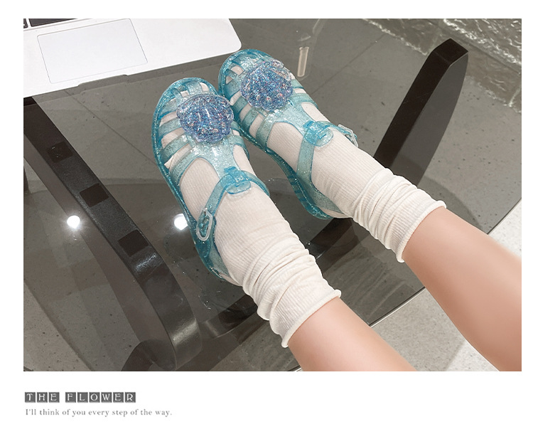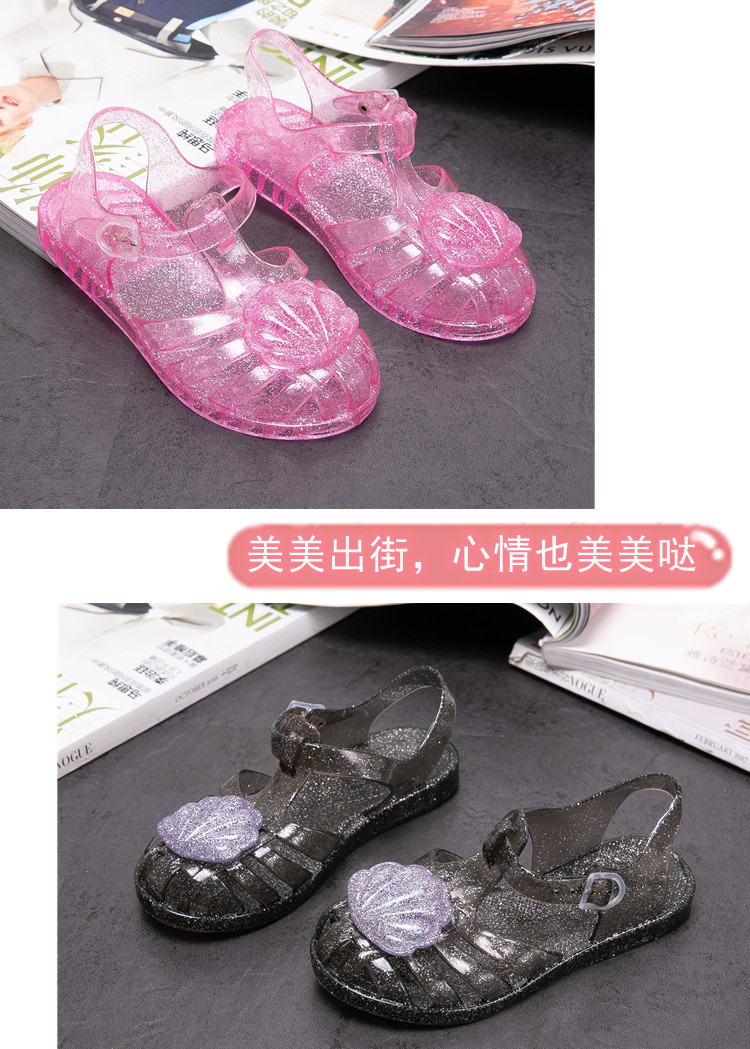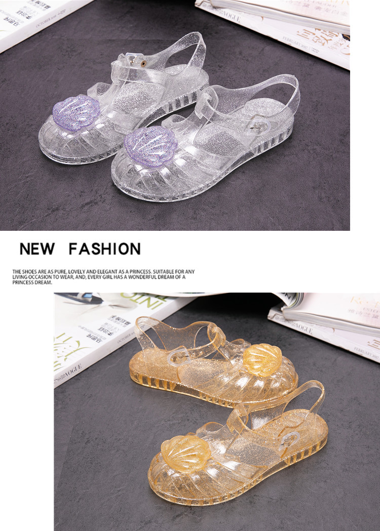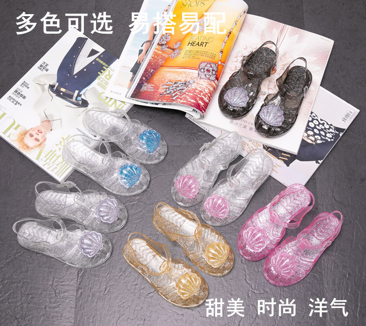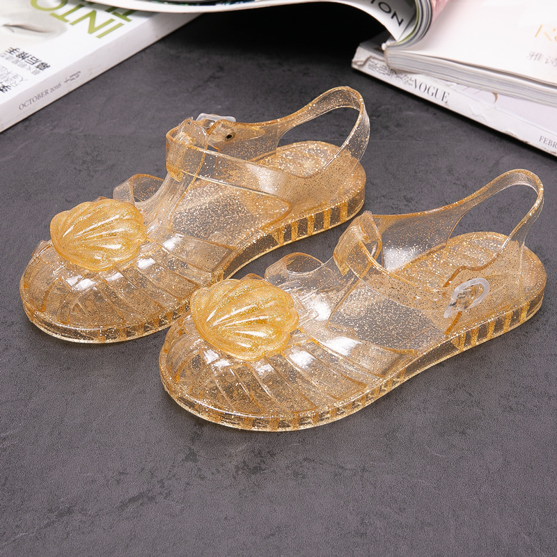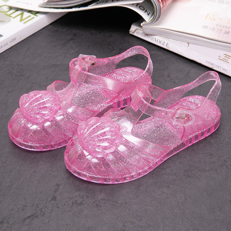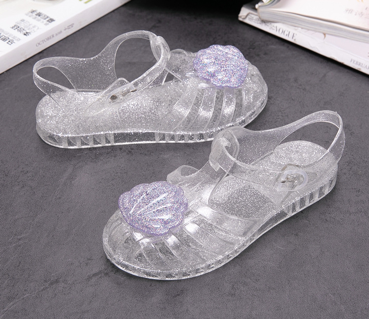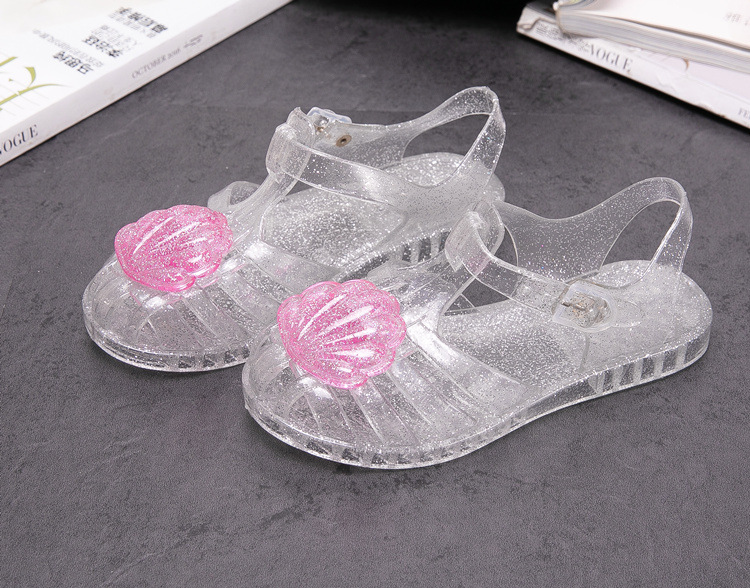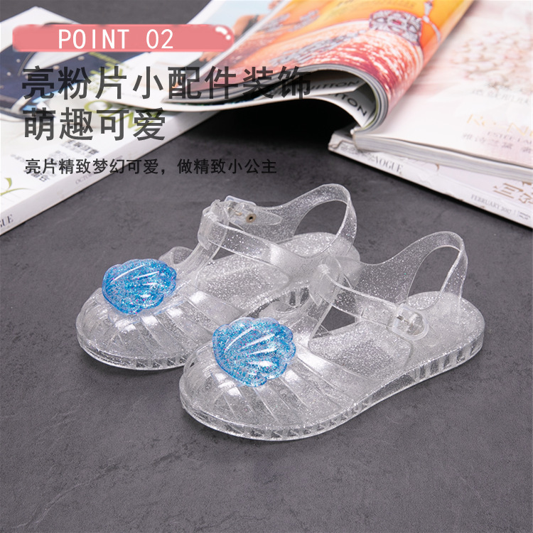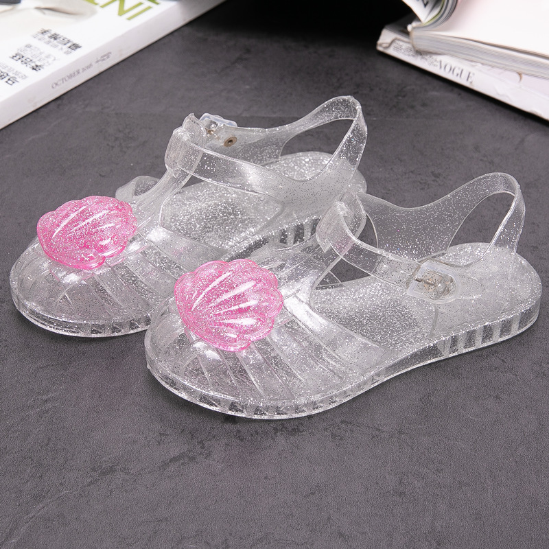 크로스 보더 어린이 샌들 소녀 부드러운 밑창 로마 신발 쉘 크리스탈 젤리 신발 공주 바람 아기 해변 신발 여름