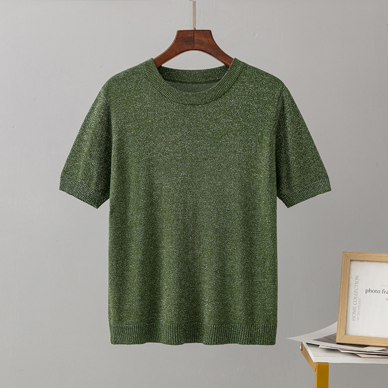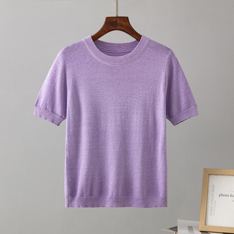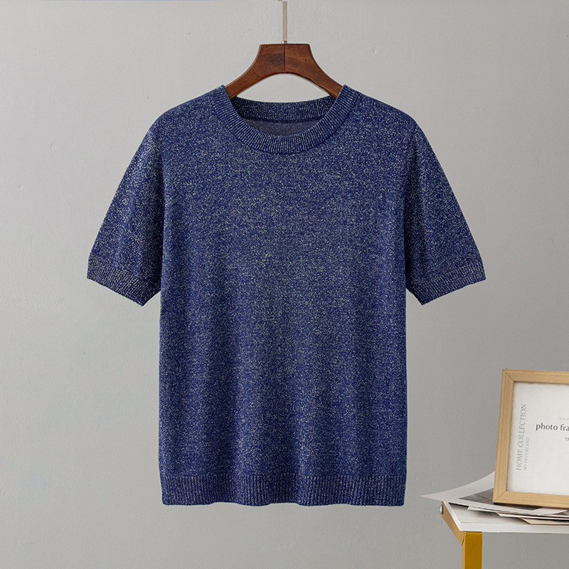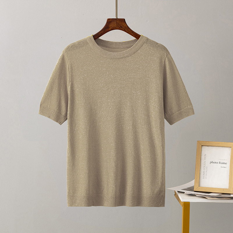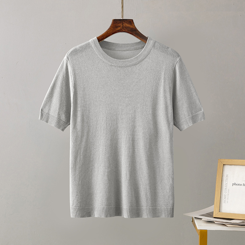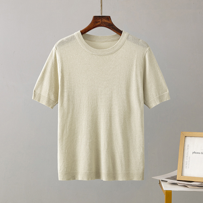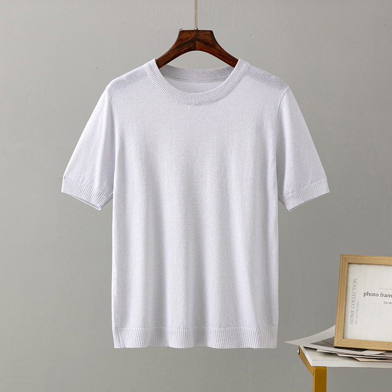 크로스 보더 여성용 2023 여름 새로운 밝은 실크 슬림핏 슬리밍 반팔 니트 스웨터 풀오버 탑 티셔츠 베이스 셔츠스토어 가기