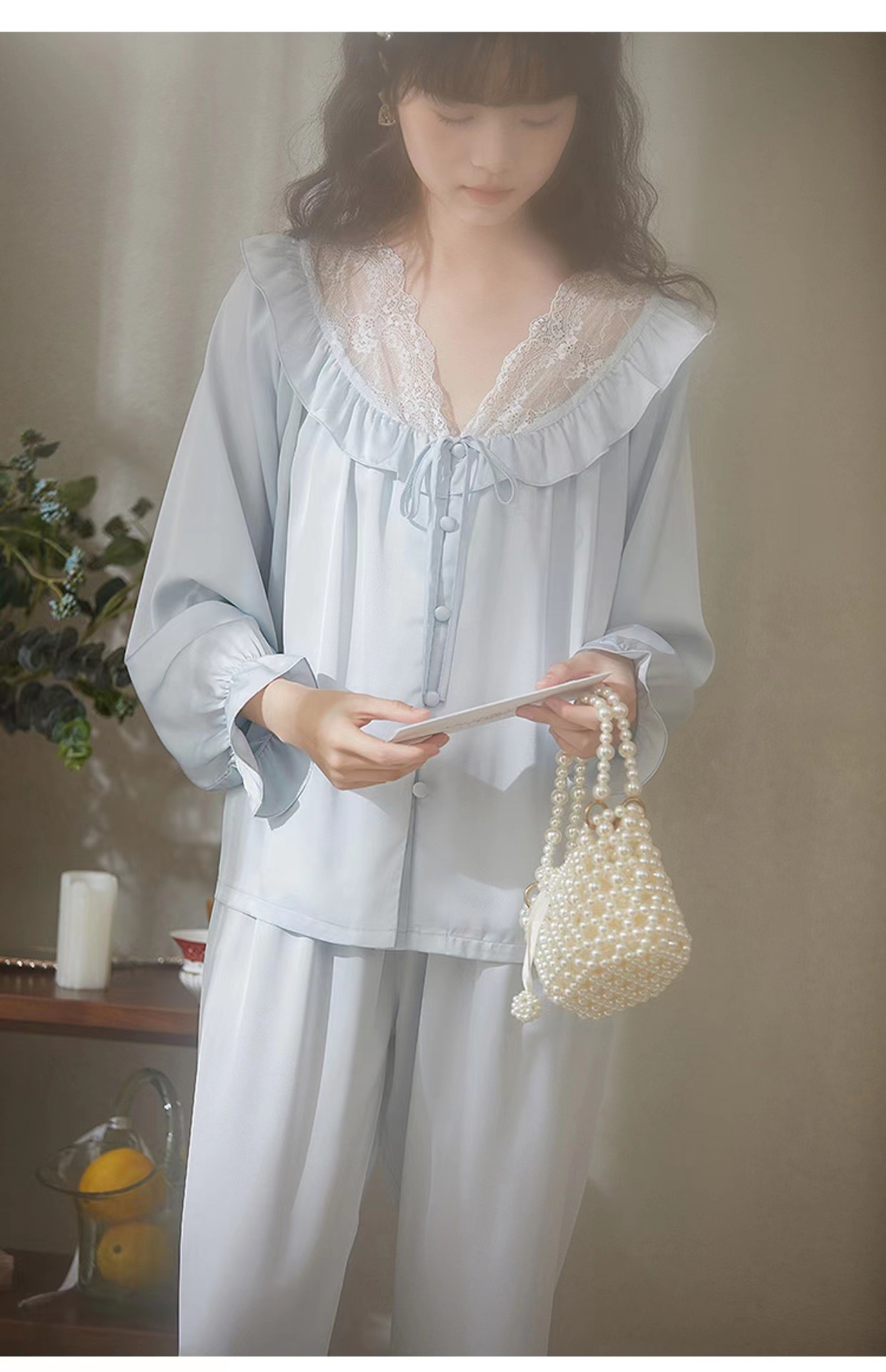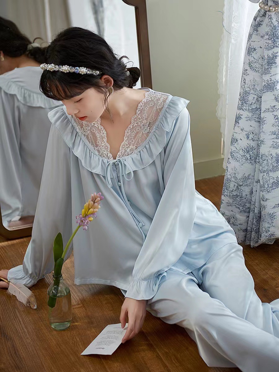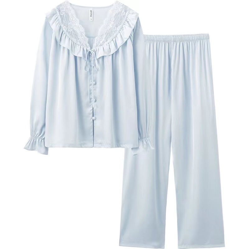 잠옷 여자의 봄과 여름 새로운 얼음 실크 새틴 레이스 순수한 욕망 스타일 레이스 업 러플 가디건 가정 옷 세트