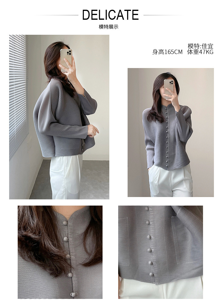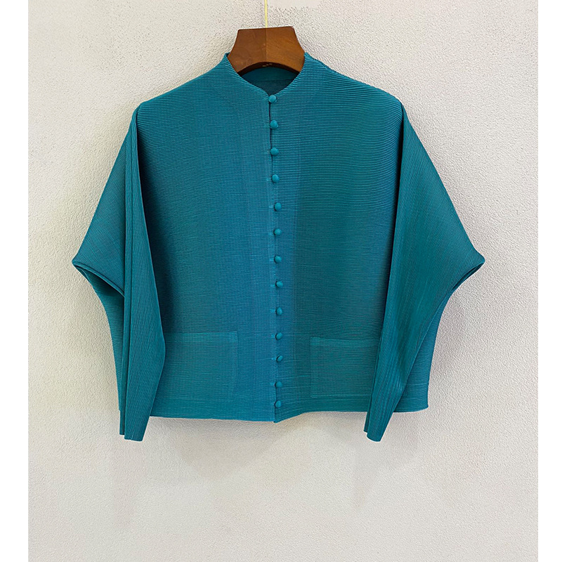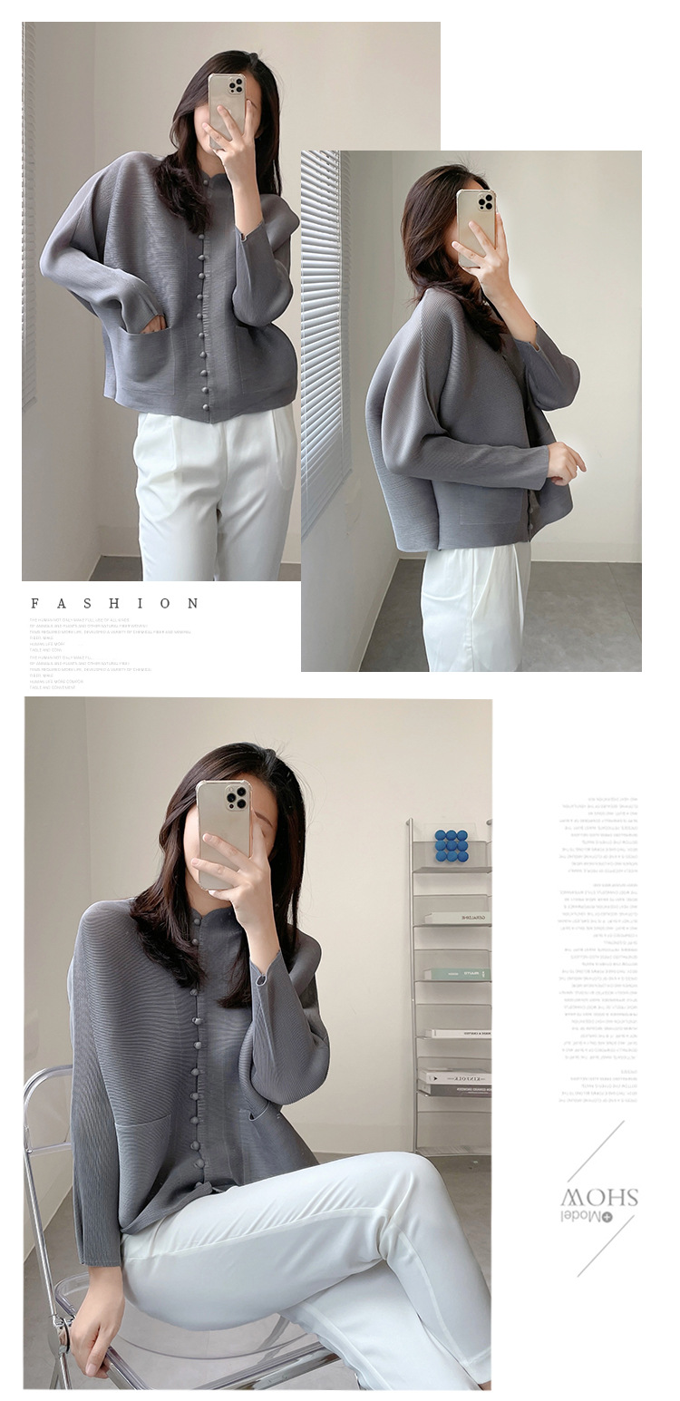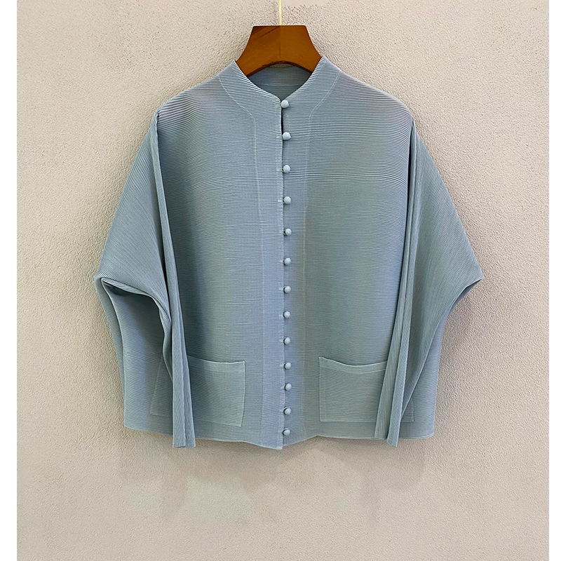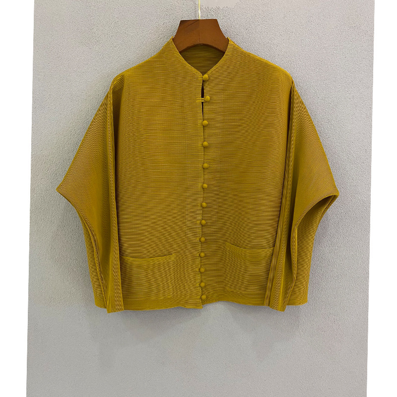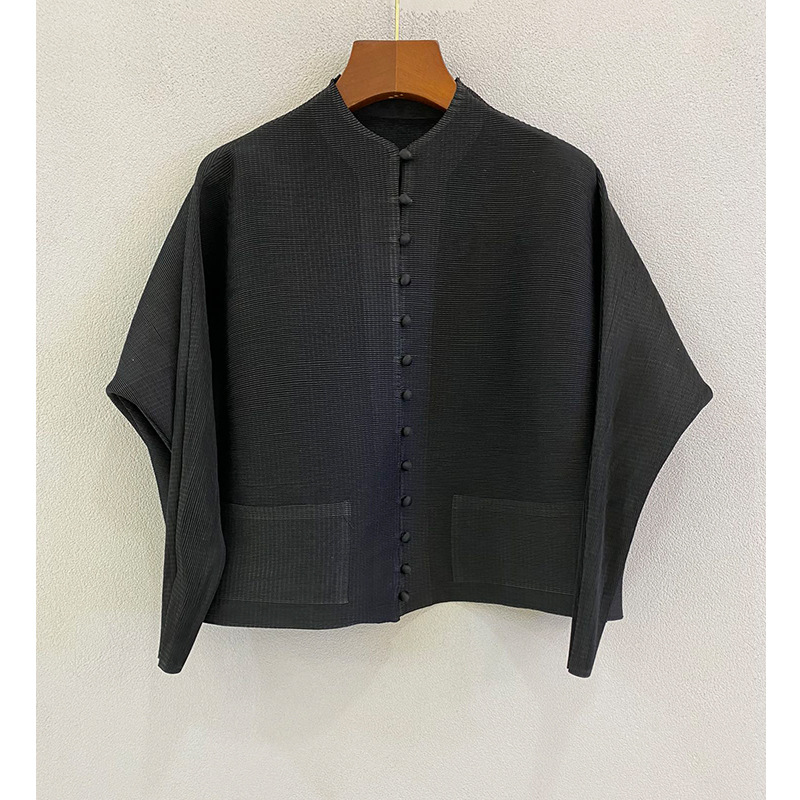 미야케 플리츠 셔츠 탑 여성 캐주얼 틈새 디자인 감각 박쥐 슬리브 느슨한 플러스 사이즈 슬리밍 셔츠 짧은 코트