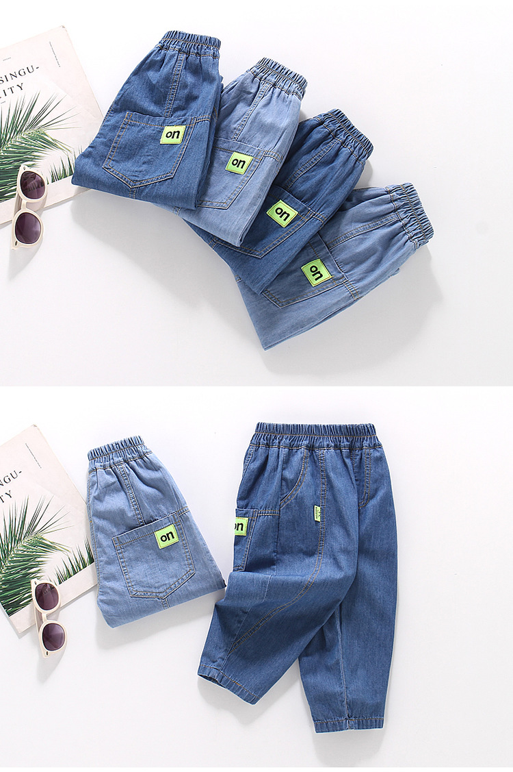 면 어린이 청바지 모기 방지 바지 얇은 통기성 형광 라벨 부드러운 데님 소년 캐주얼 바지 여름 패션
