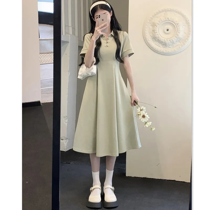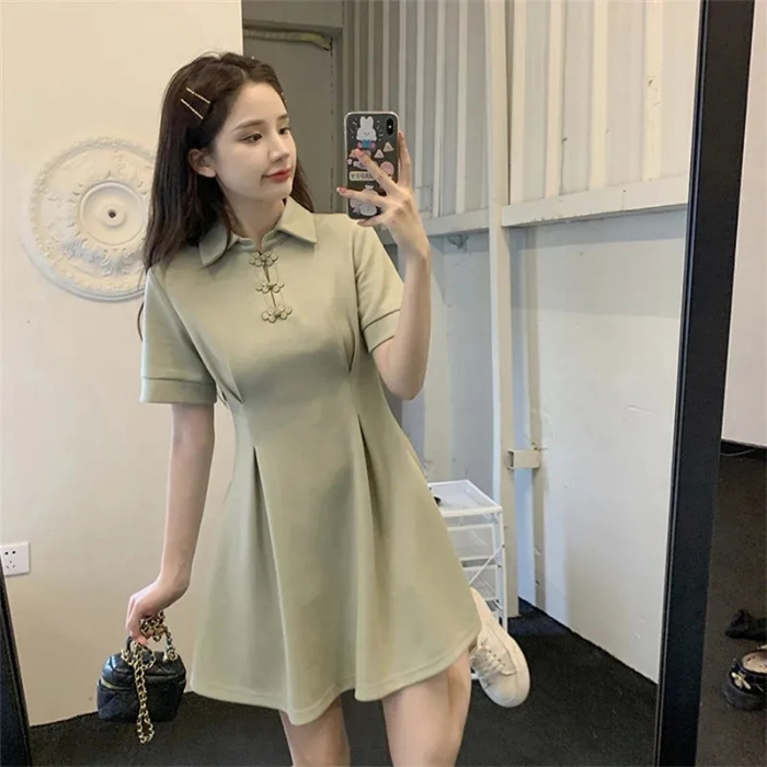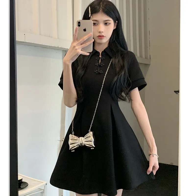 햅번 새로운 중국식 버클 POLO 칼라 블랙 스커트 여름 플러스 사이즈 반팔 캐주얼 티셔츠 원피스 통통녀