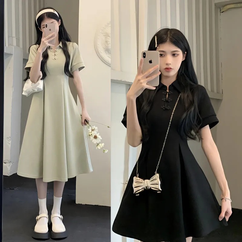 햅번 새로운 중국식 버클 POLO 칼라 블랙 스커트 여름 플러스 사이즈 반팔 캐주얼 티셔츠 원피스 통통녀스토어 가기