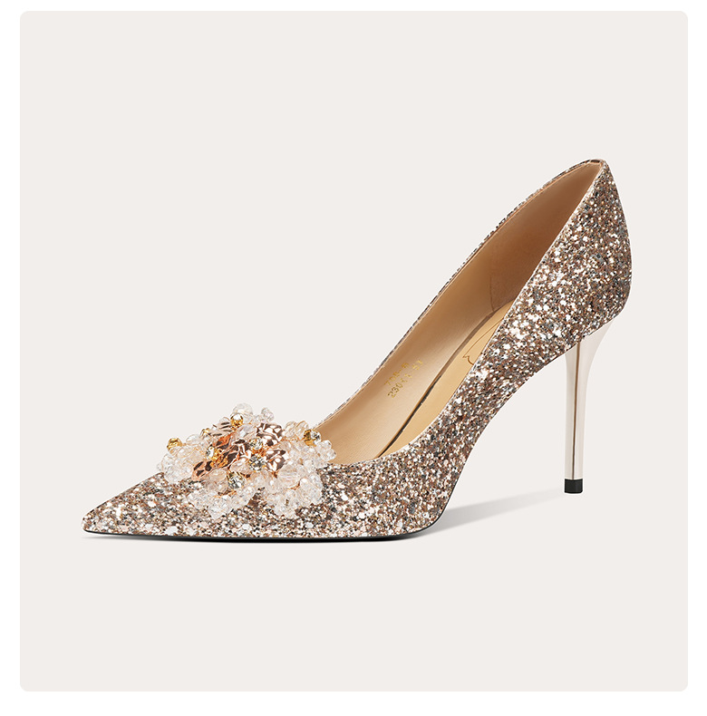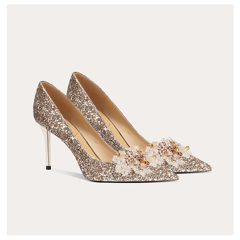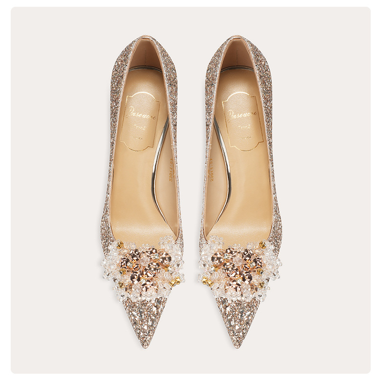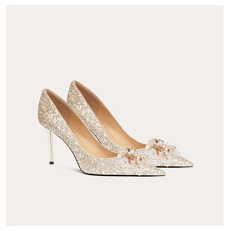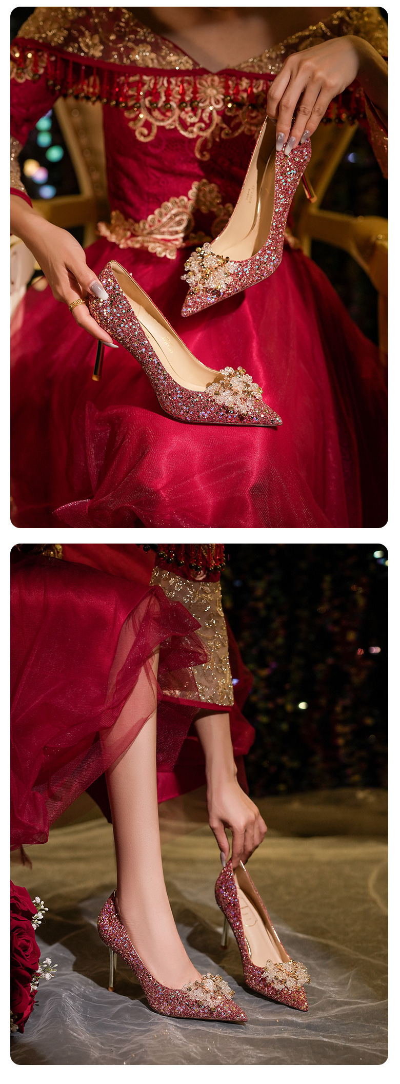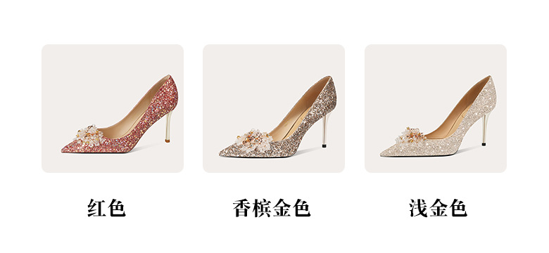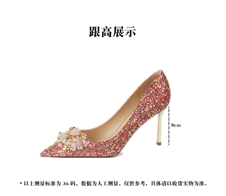 [양가죽] 반짝이 뾰족한 크리스탈 웨딩 슈즈 프렌치 스틸레토 힐 중국 신부 신발 레드 라인 석 하이힐 여성