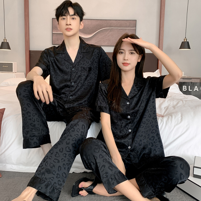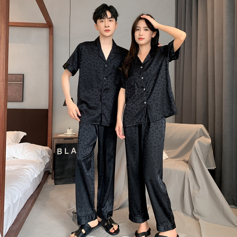 블랙 레오파드 무늬 여름 커플 잠옷 여자와 남자의 봄과 가을 신상품 바지 짧은 소매 실크 실크 가정 옷 세트