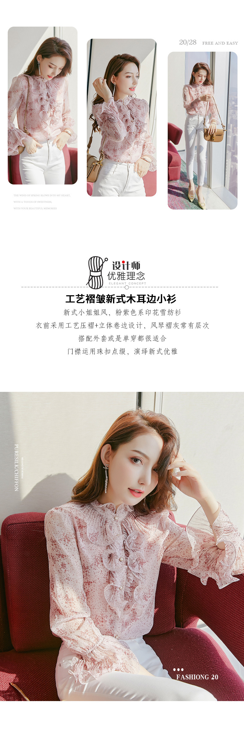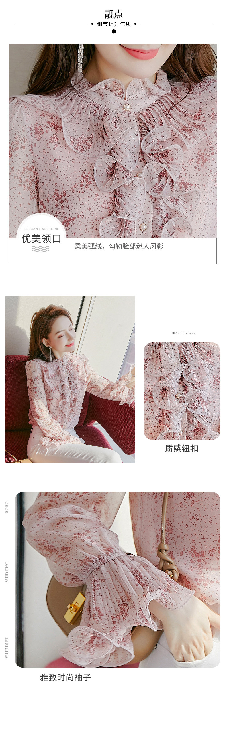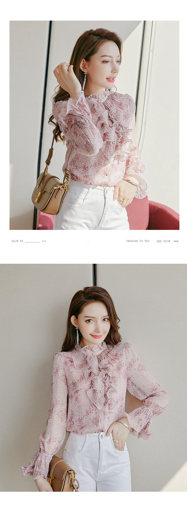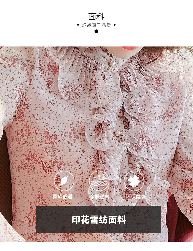 원피스 Dropshipping 인쇄 쉬폰 셔츠 여성 긴 소매 봄 2022 새로운 프릴 스탠드 칼라 기질 프랑스 스타일 탑