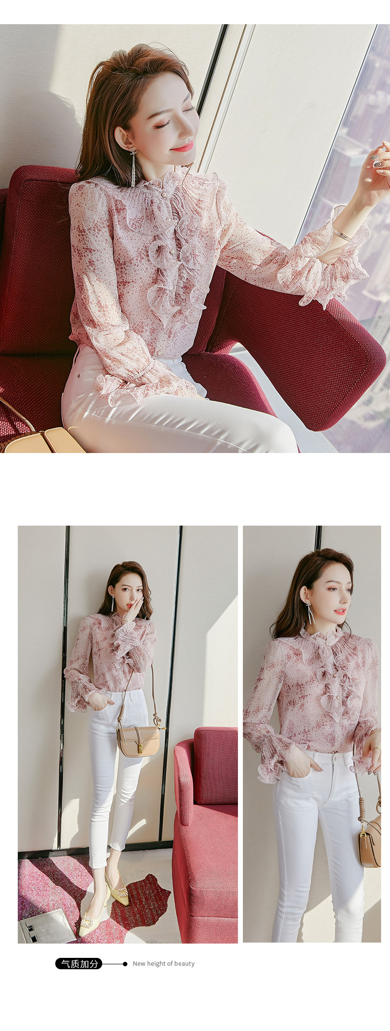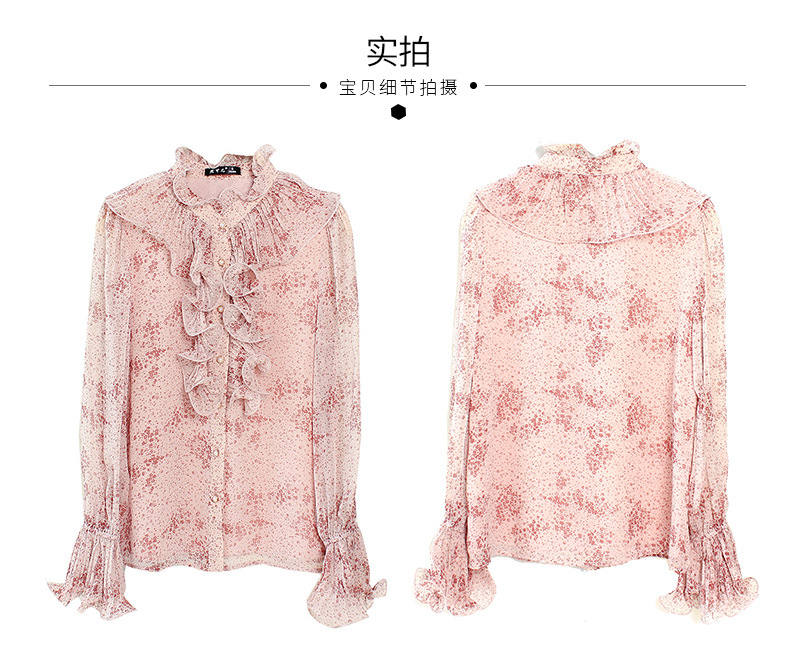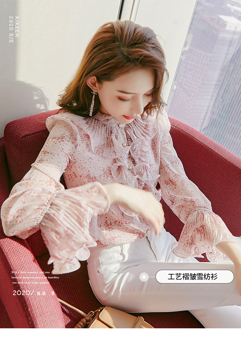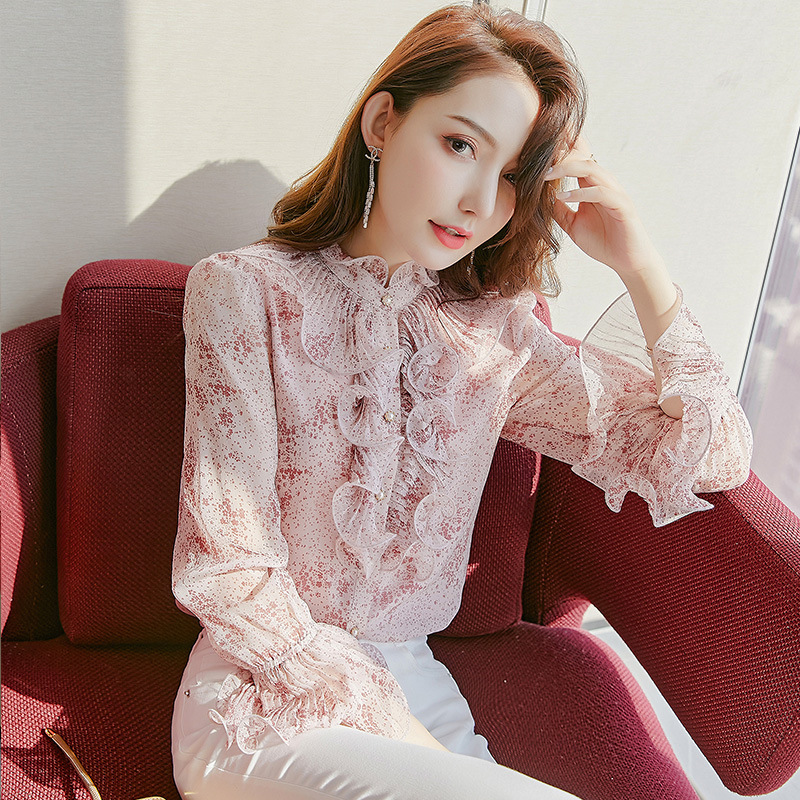 원피스 Dropshipping 인쇄 쉬폰 셔츠 여성 긴 소매 봄 2022 새로운 프릴 스탠드 칼라 기질 프랑스 스타일 탑스토어 가기