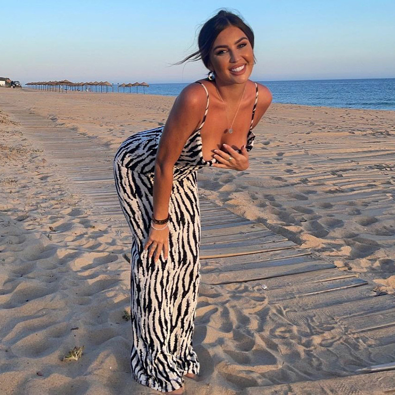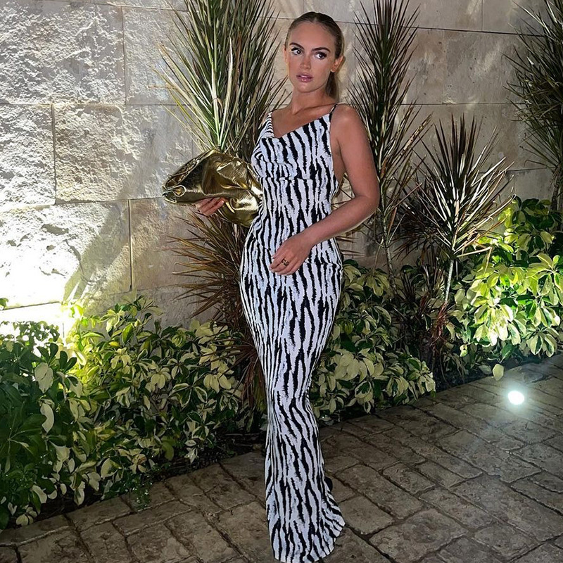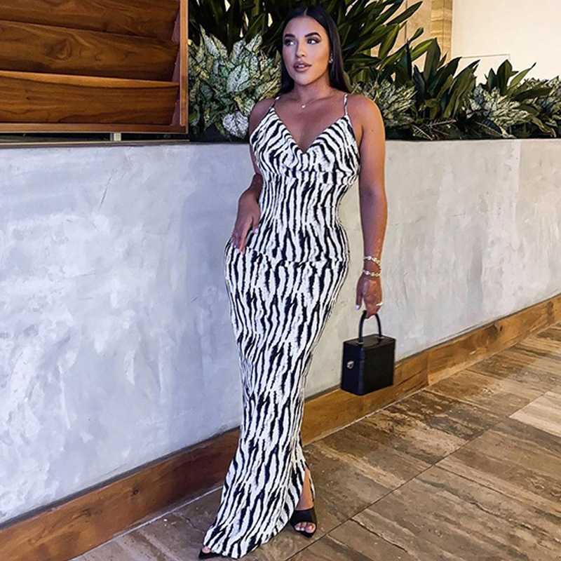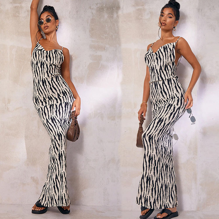 유럽과 미국 스타일의 여성 의류 2023 여름 크로스 국경 대외 무역 새로운 패션 인쇄 섹시한 V-칼라 백리스 스트랩 원피스