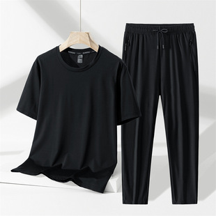 凉感冰丝套装男士夏季薄款速干透气运动休闲短袖T恤长裤两件套男