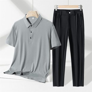 轻商务时尚冰丝套装男士夏季薄款速干POLO衫丝滑免烫休闲裤两件套