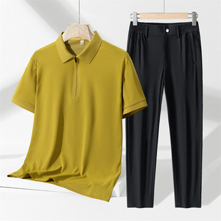轻商务夏季高端休闲套装男无痕冰丝POLO衫中年男士冰丝西裤两件套