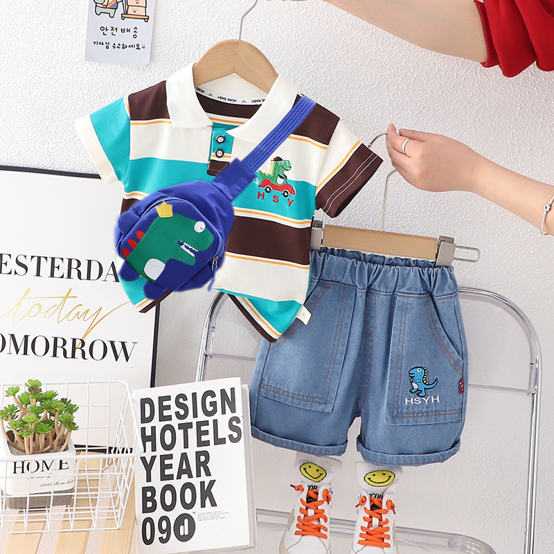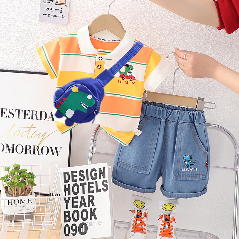 • 노란색 + 녹색 가방 HSY-컬러 스트립 플래켓 공룡 반팔 세트