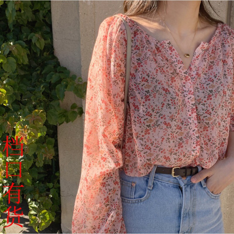 봄과 여름 풀오버 레이스 핑크 쉬폰 우아한 통근 인쇄 긴 소매 느슨한 레이스 칼라 베이스 셔츠스토어 가기