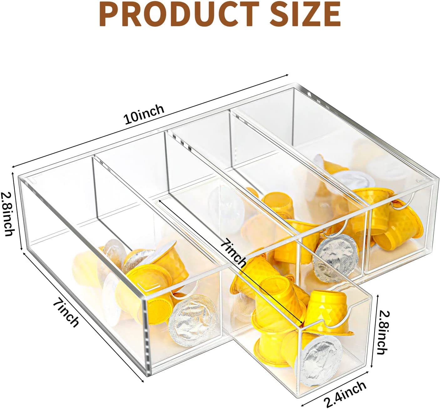 ☕ 【用途广泛】:除了存放和整理咖啡胶囊外,我们的亚克力储物抽屉还可以存放化妆品、化妆工具、太阳镜、糖包、茶包、桌面杂物等,广泛用于厨房、 厕所、办公室、学校等