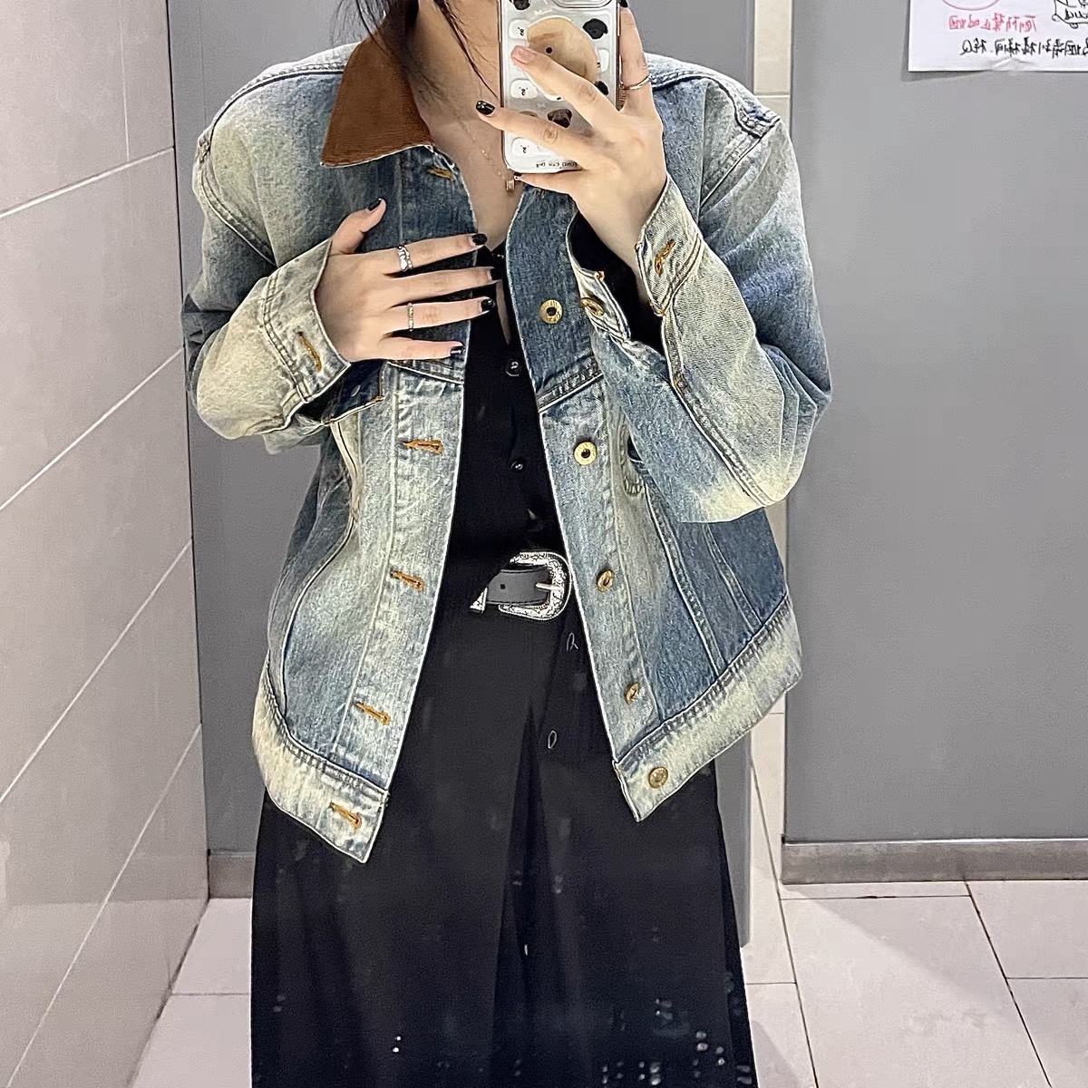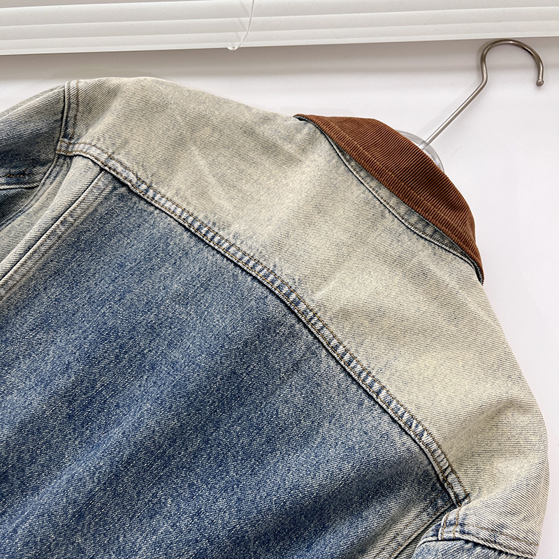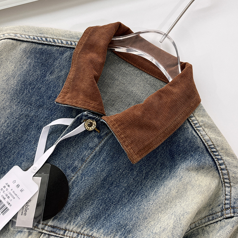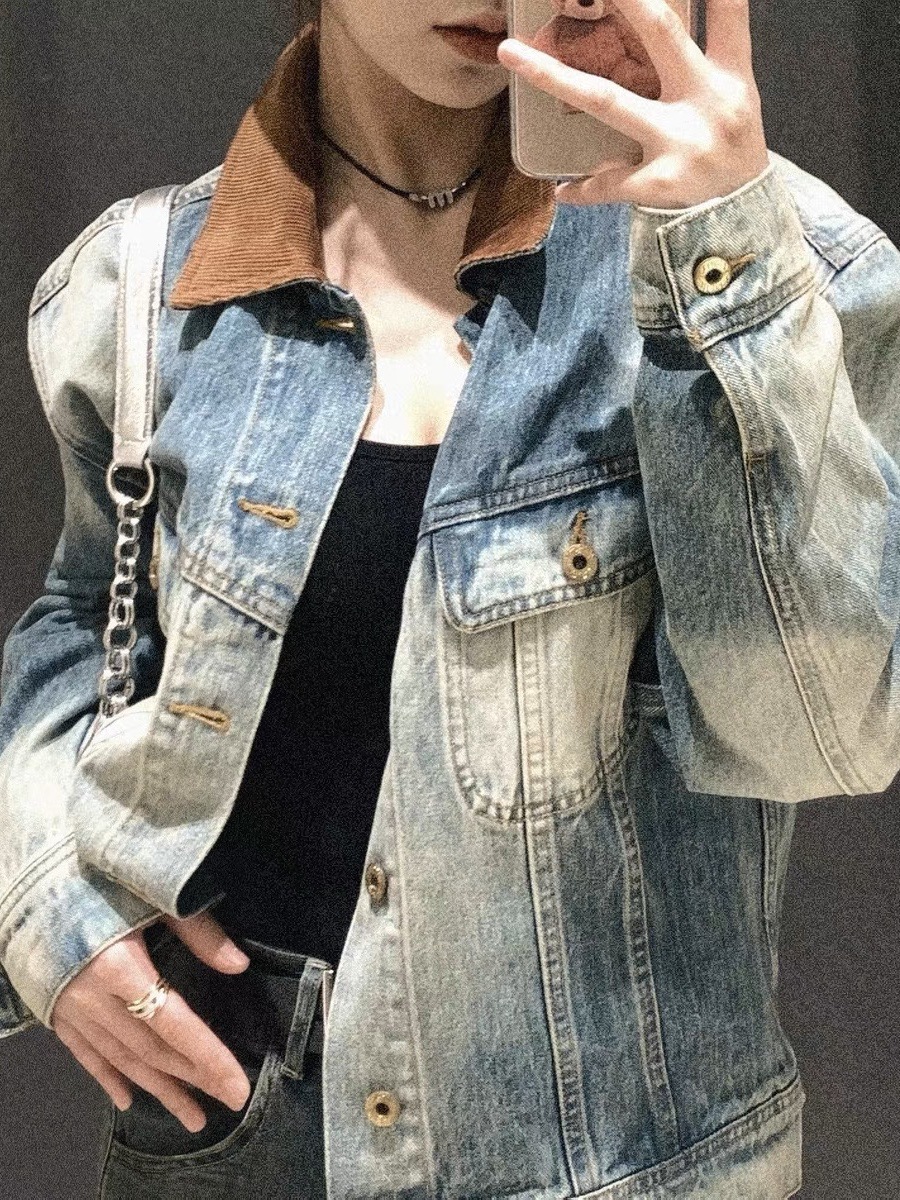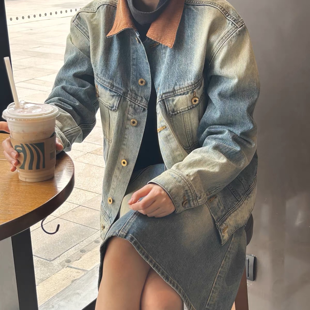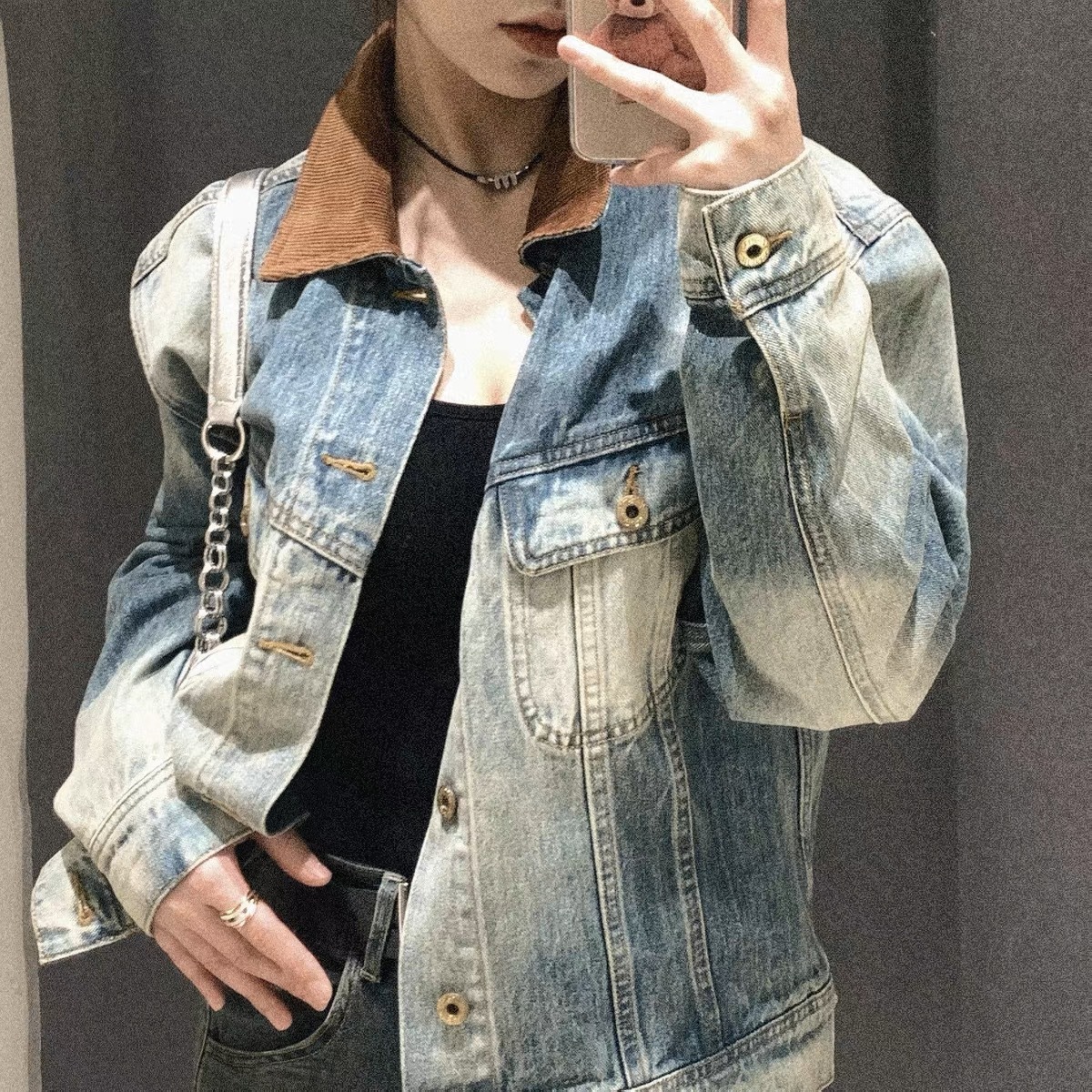 여성을위한 새로운 스타일 올드 워시 블루 코듀로이 칼라 레트로 오프 숄더 실루엣 데님 재킷 3005스토어 가기