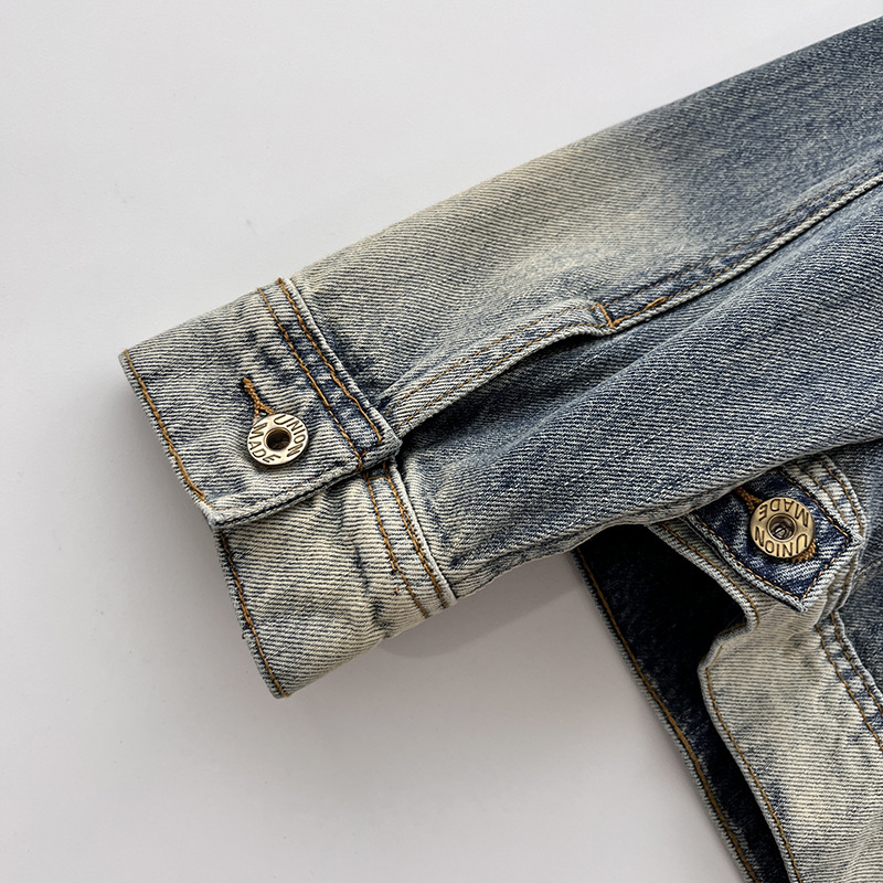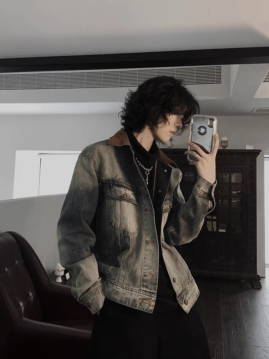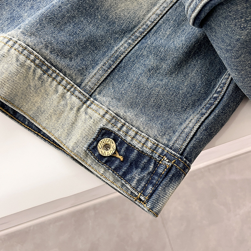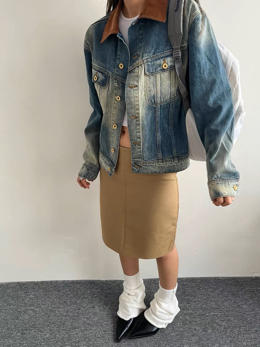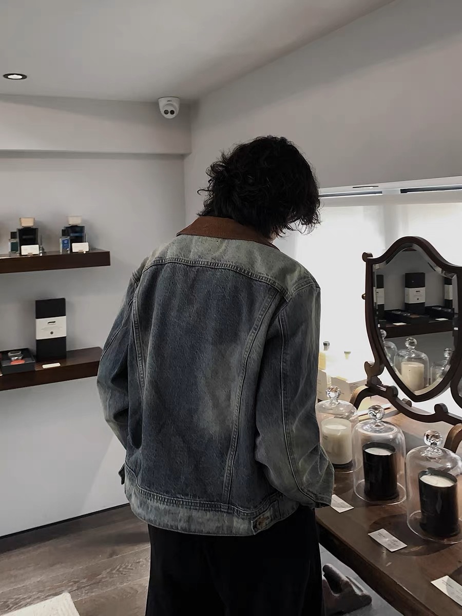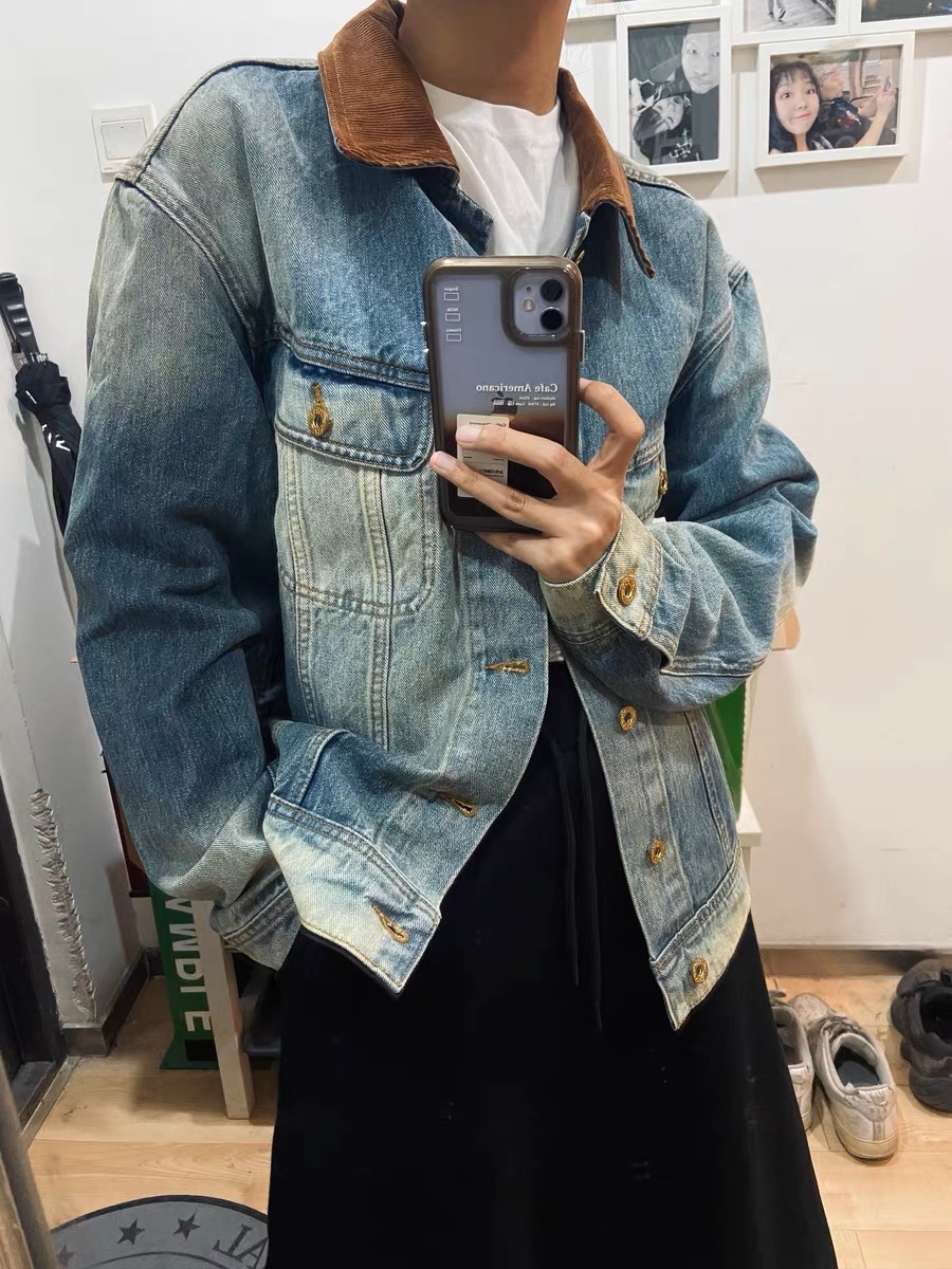 여성을위한 새로운 스타일 올드 워시 블루 코듀로이 칼라 레트로 오프 숄더 실루엣 데님 재킷 3005스토어 가기