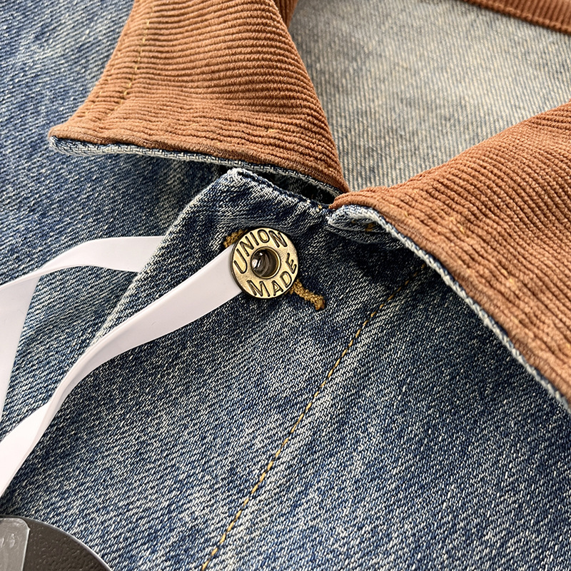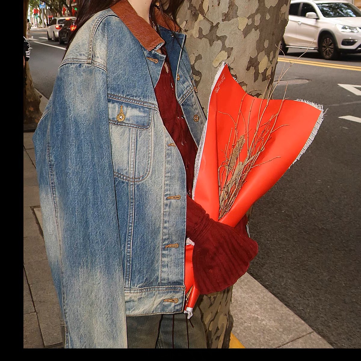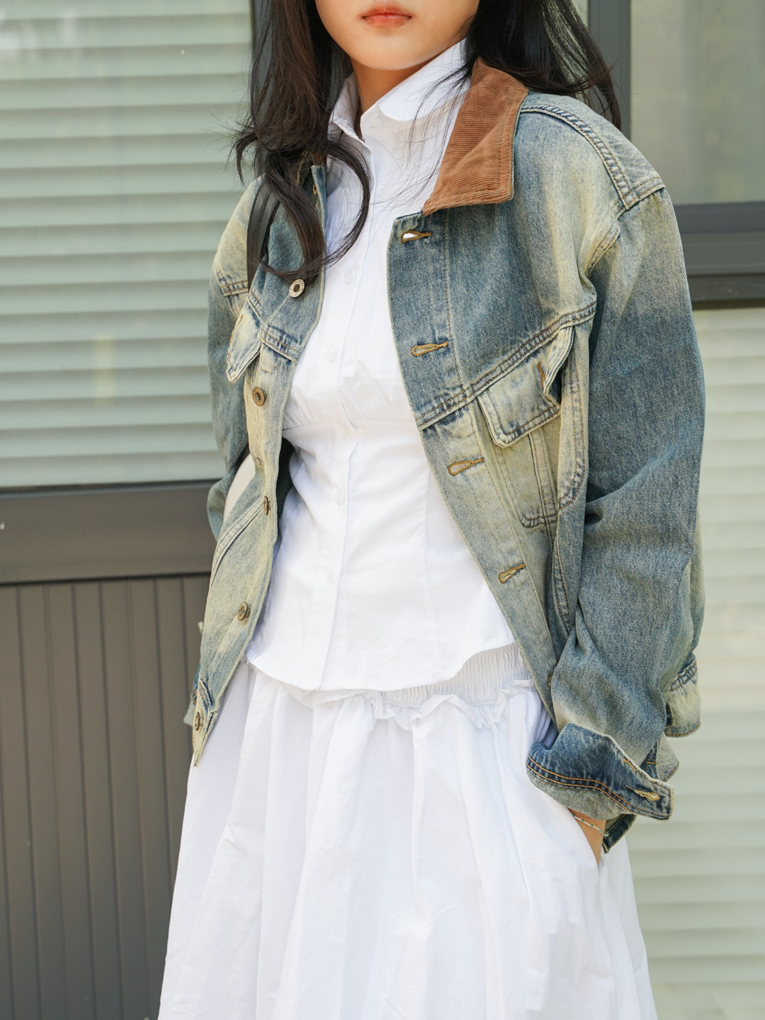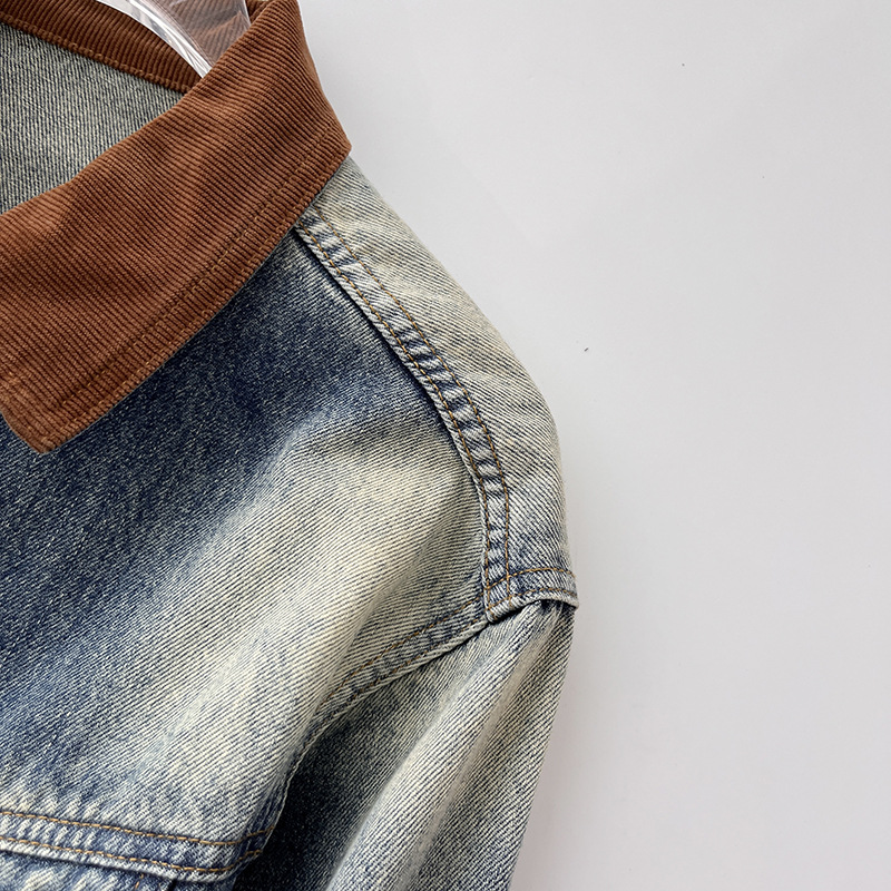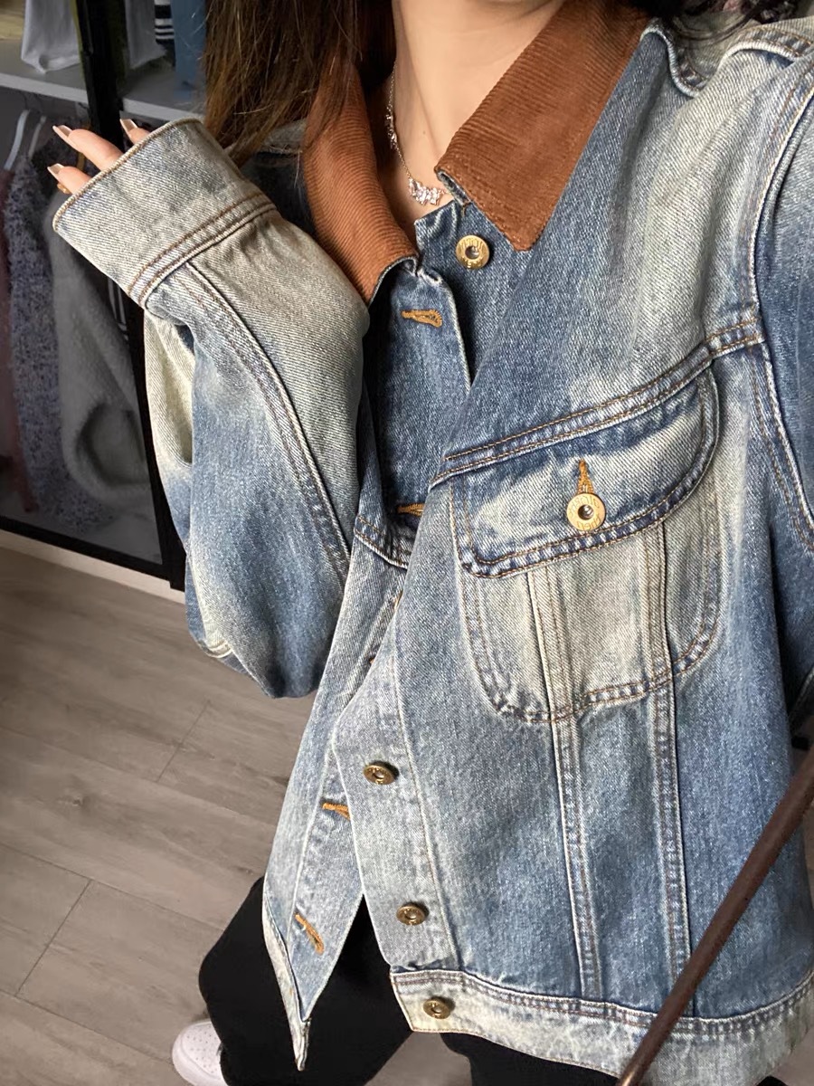 여성을위한 새로운 스타일 올드 워시 블루 코듀로이 칼라 레트로 오프 숄더 실루엣 데님 재킷 3005