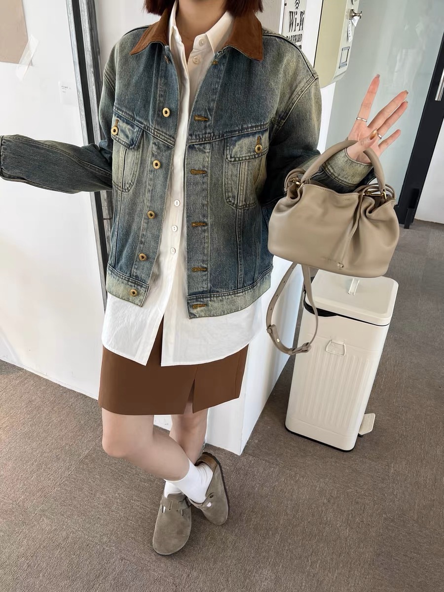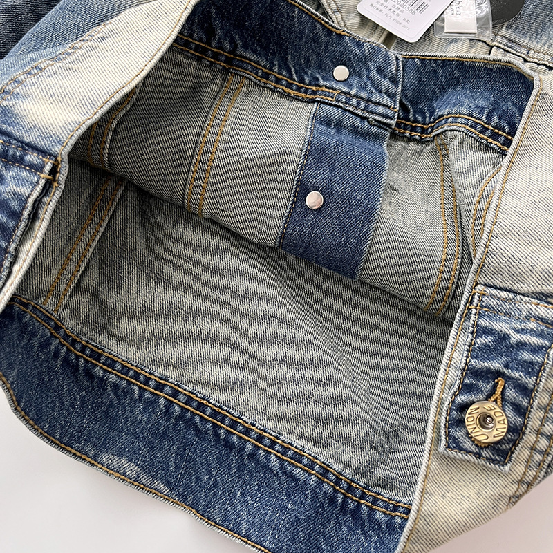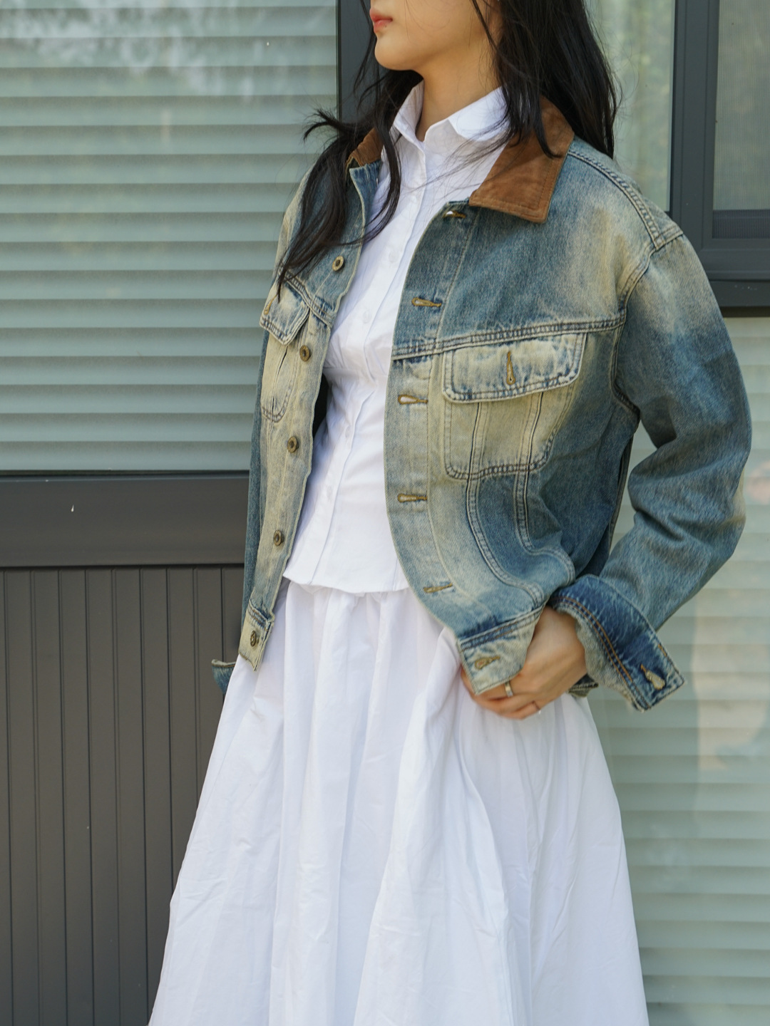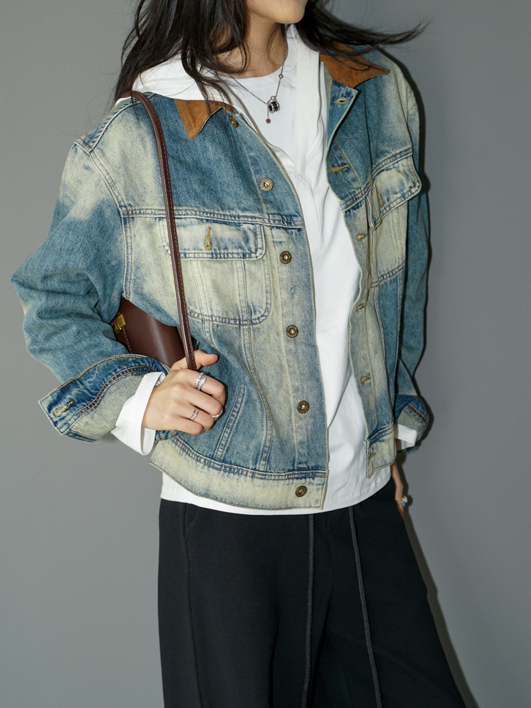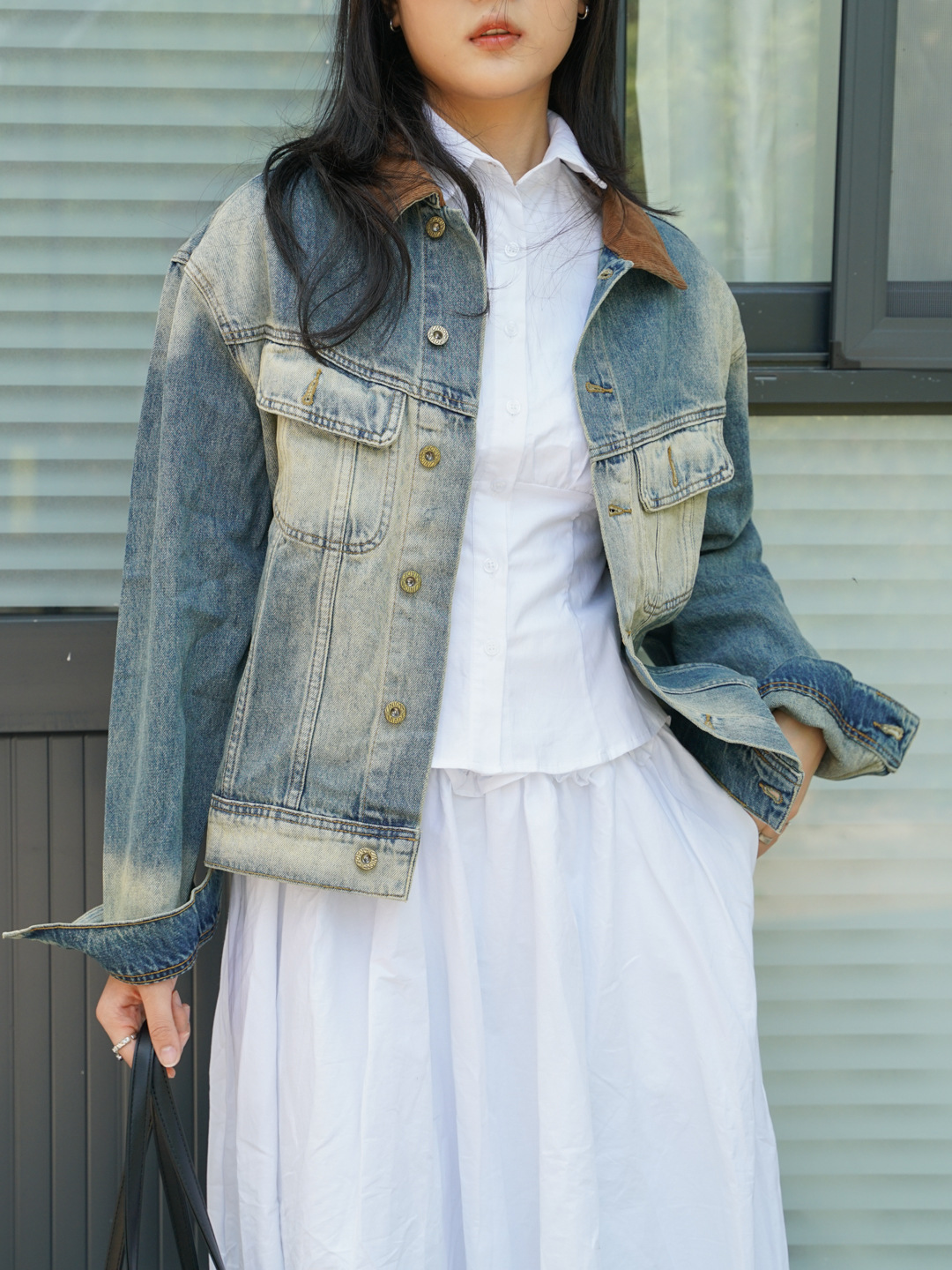 여성을위한 새로운 스타일 올드 워시 블루 코듀로이 칼라 레트로 오프 숄더 실루엣 데님 재킷 3005