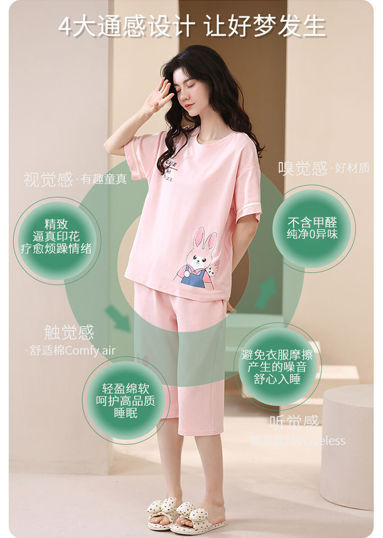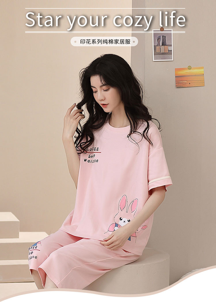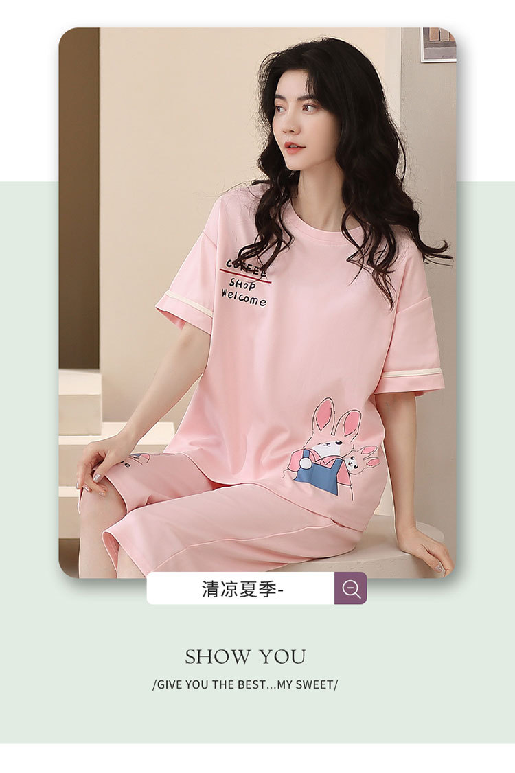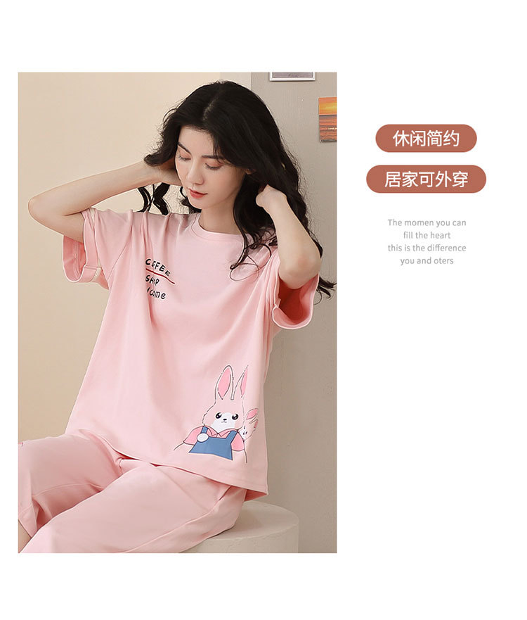 여름 새로운 여자의 면 잠옷 핑크 여자의 캐주얼 크루넥 반팔 카프리 바지 캐주얼 가정복 세트스토어 가기
