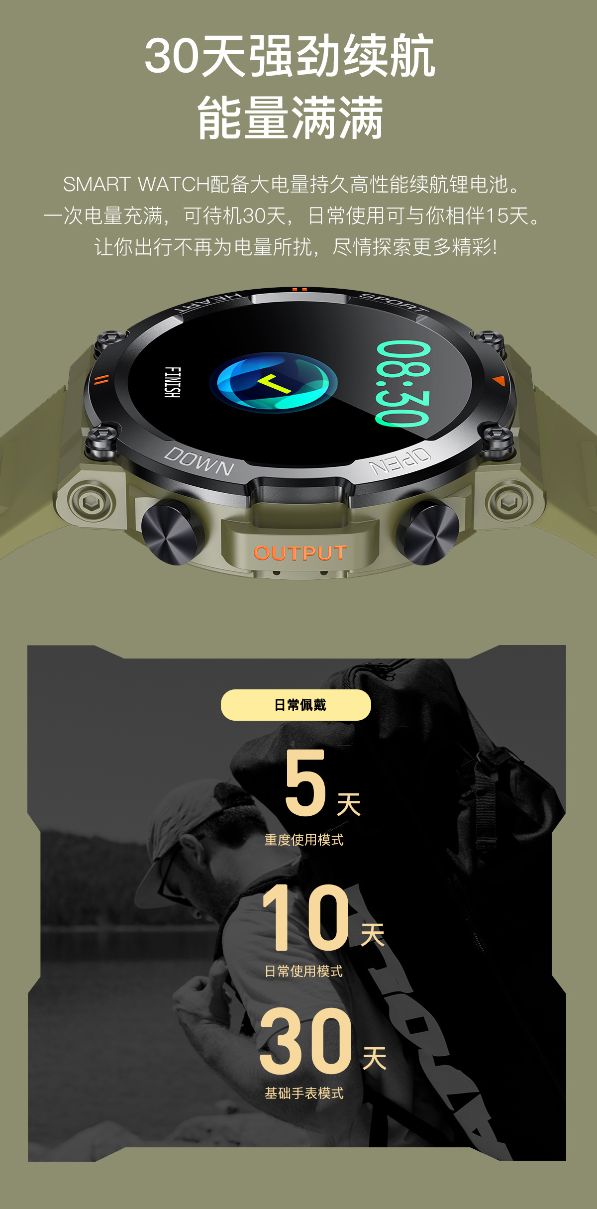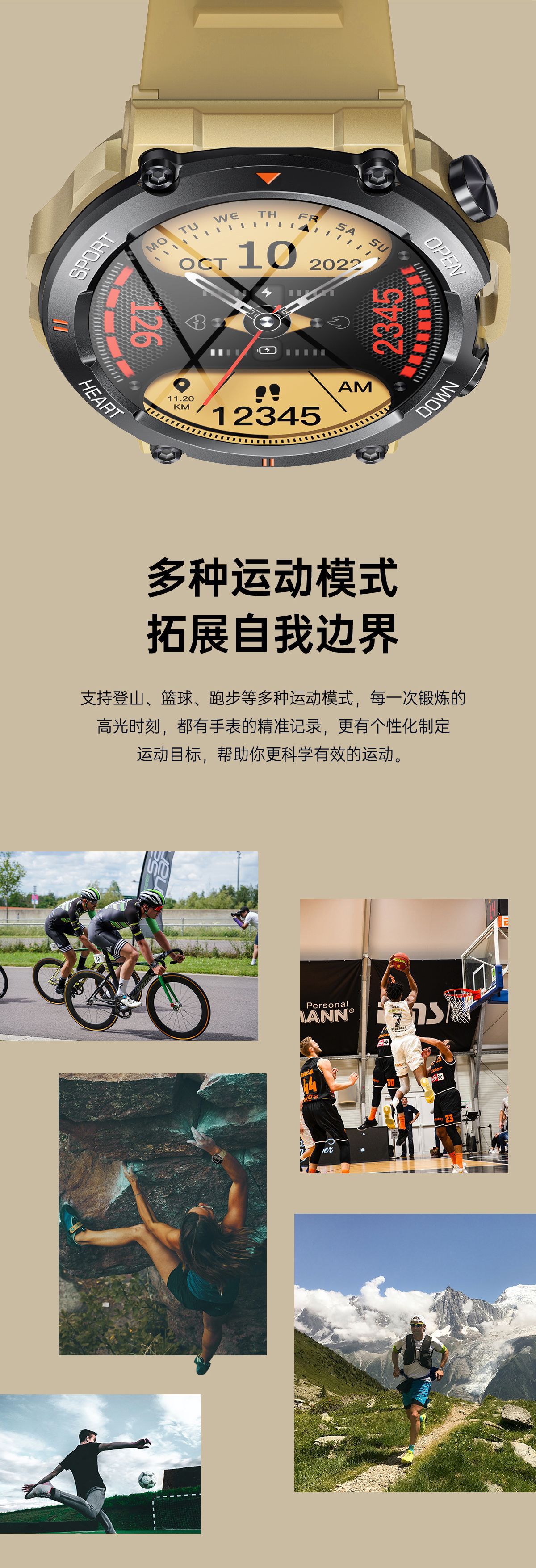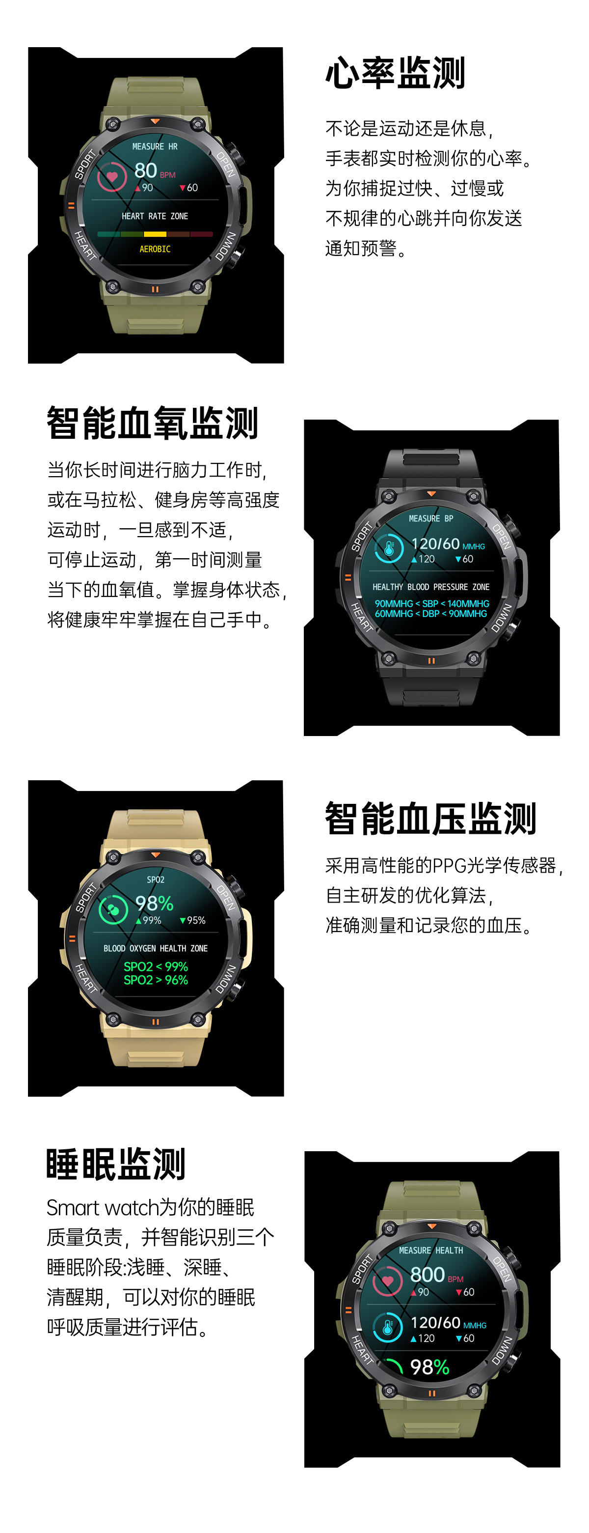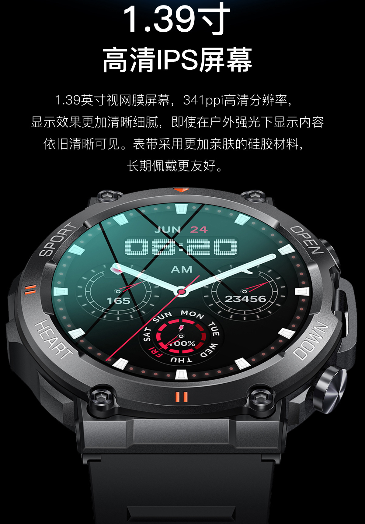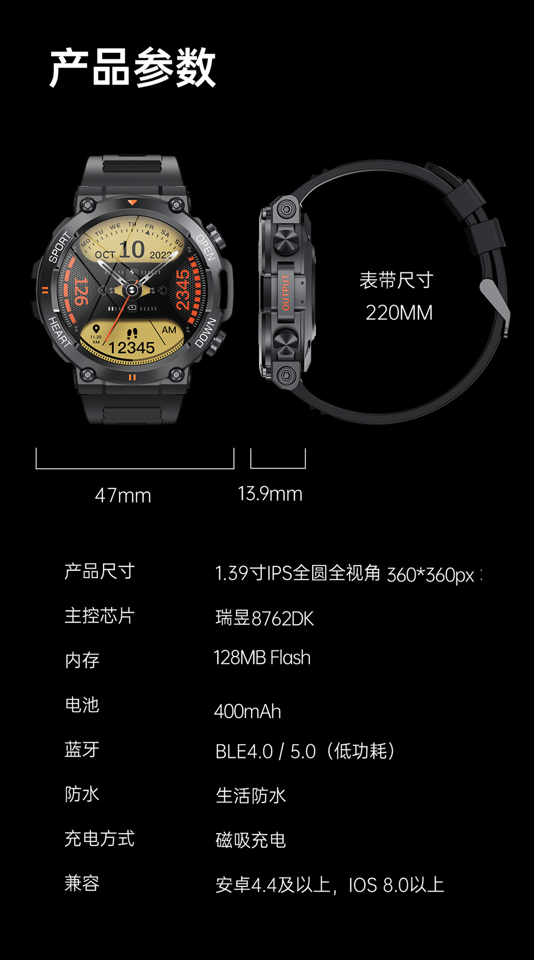 1.39寸IPS方屏全视角1.39 inch IPS screen易更换表带,标准22mmDetachable 22mm strap Standard 海量表盘推送,自定义表盘Multiple watch faces pushing,Customized watch faces蓝牙通话/蓝牙音乐(超清晰音质),天气显示Bluetooth calling/BT music(Superior clear audio like sound effect),Weather心率检测、血压检测、血氧检测,全天心率检测Heart rate detection/Blood pressure detection/Blood oxygen detection/Wole-day heart rate monitor时间显示,计步,卡路里,距离,心率,血压,血氧,睡眠时间,开关机显示,秒表,多运动模式Timer ,Pedometer,Calorie Consumption,Distance Calculation,Heart rate,Blood pressure,Blood oxygen,Sleep time /quality,On & Off dispaly,Multiple sport modes睡眠监测(睡眠时间、睡眠质量)Sleep detection (Sleep time ,Sleep quality)来电通知,信息提醒,多国语言推送,闹钟提醒,远程拍照,久坐提醒Calls to remind,SMS Reminder,Third-party messaging reminder Multilingual push,Clock alarm,Remote Camera,Sedentary reminder手环支持多国语言English,Chinese,Japanese,German,French,Spanish,Arabic,Russian,Ukrainian,Russian,Portuguese400毫安大电池,超长待机,屏幕显示在户外非常亮400mAh big battery,super long standby time,Bright screen under sunshine同步数据到APK/APPSynchronous data to APK/APP安卓和苹果应用同步Dafit