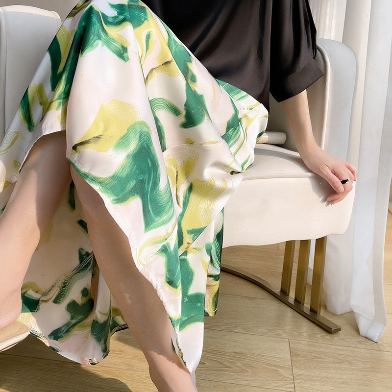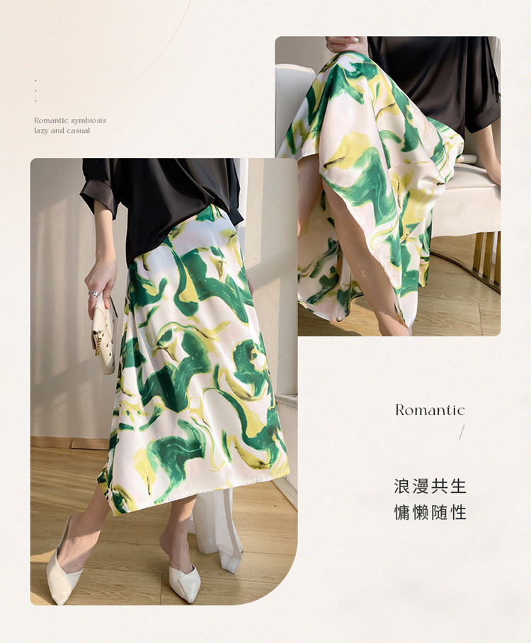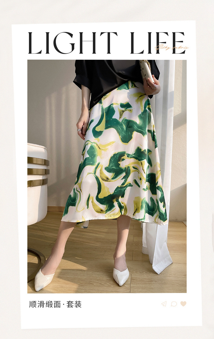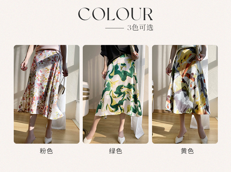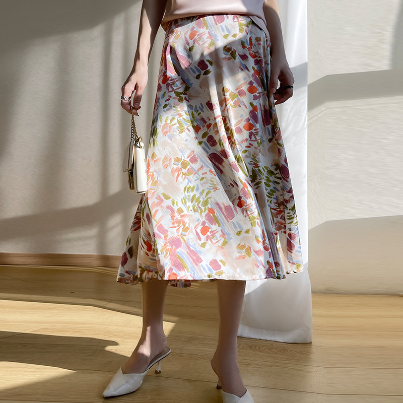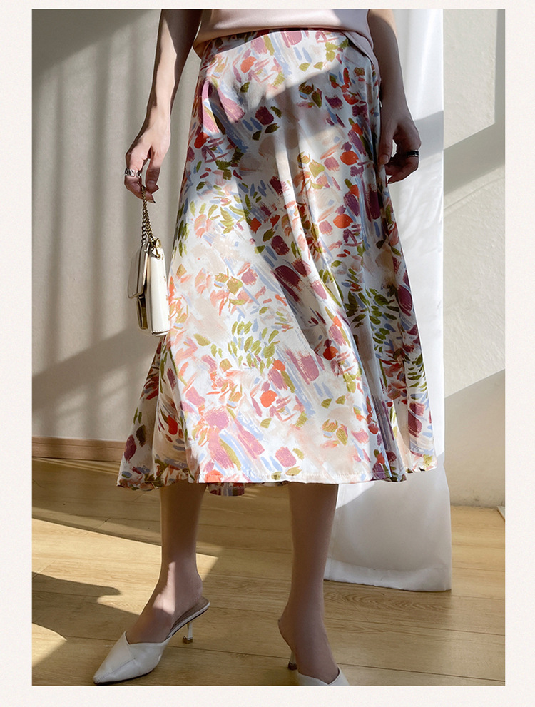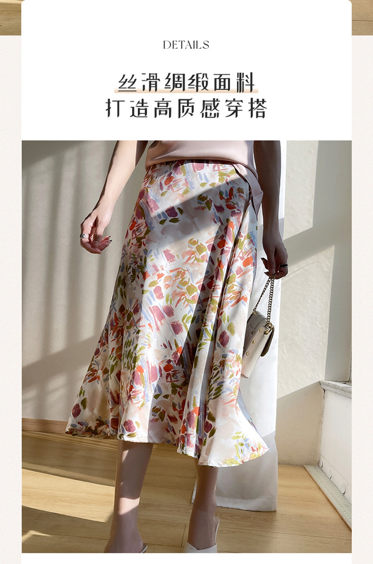 플로럴 스커트 여성용 2023 새로운 프랑스 스타일 유화 인쇄 아세트산 새틴 피쉬 테일 스커트 하이 웨이스트 우아한 미디 스커트