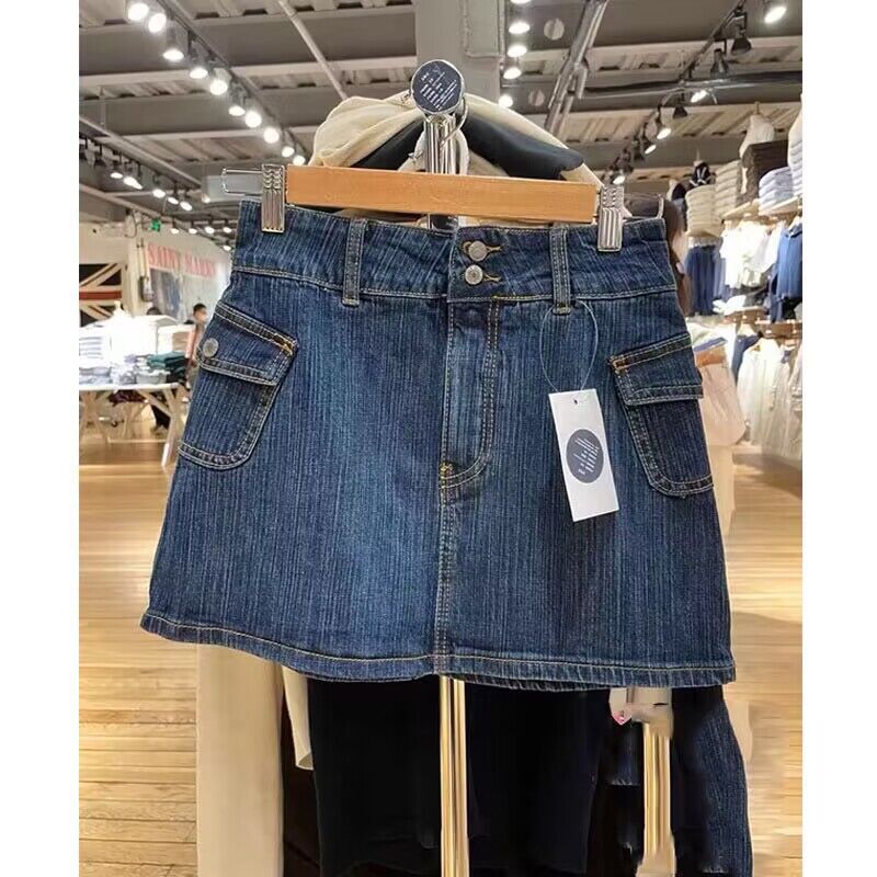 BM 스타일 아메리칸 레트로 더블 버튼 하이웨이스트 사이드 포켓 블루 데님 미니 스커트 여성 워크웨어 스커트 트렌디스토어 가기