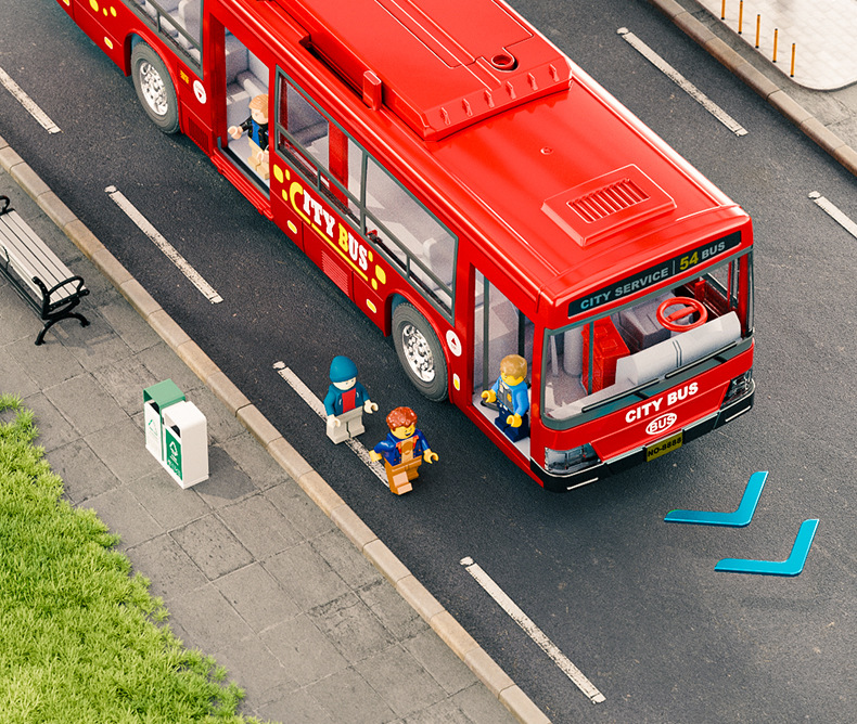 • 녹색 버스 충전 + 인형 3개 + 버스 정류장 + 신호등
