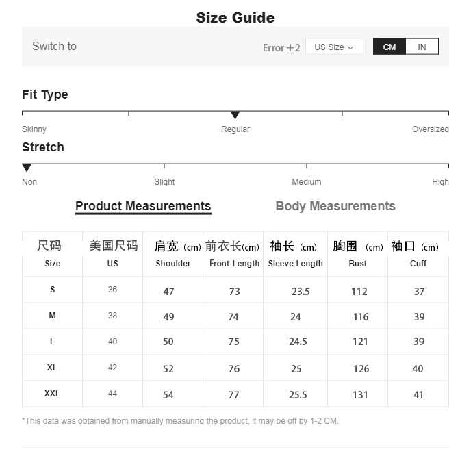 Size: XXL(US 44): Shoulder 54cm; Length 77cm; Sleeve:25.5cm; Bust:131cm