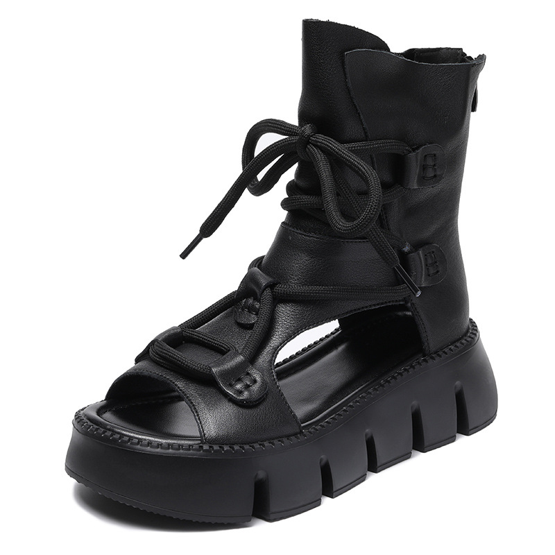 2023 여름 새로운 빈티지 중공 정품 가죽 하이탑 로마 레이스 업 두꺼운 단색 상승 기사 부츠 샌들 여성용