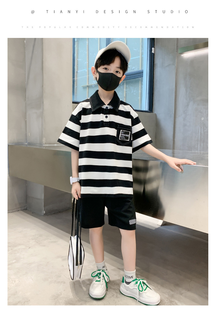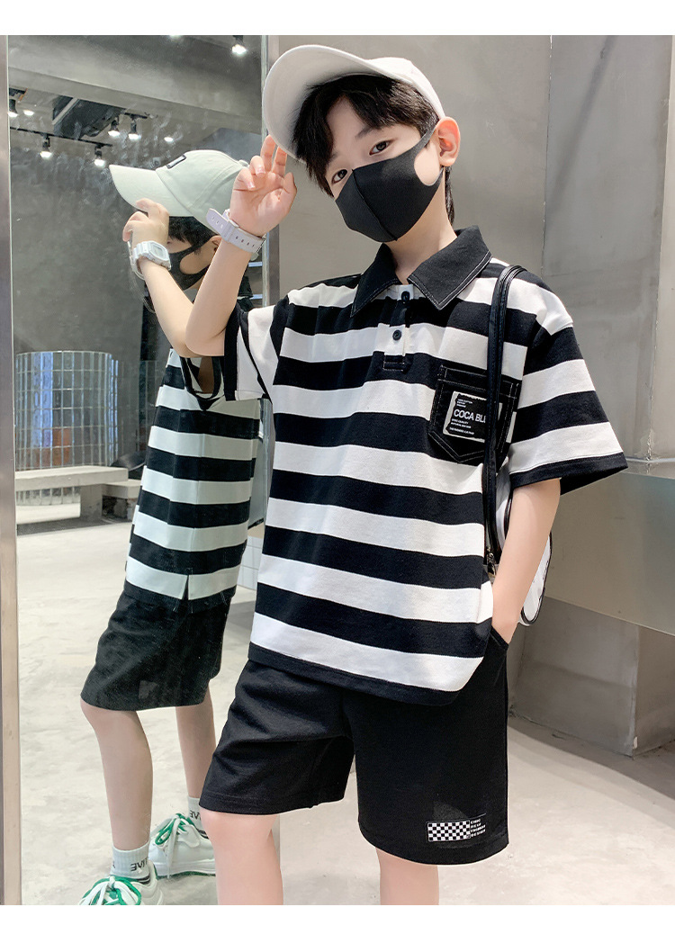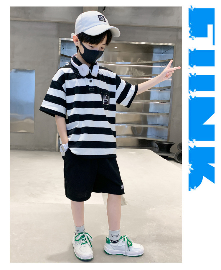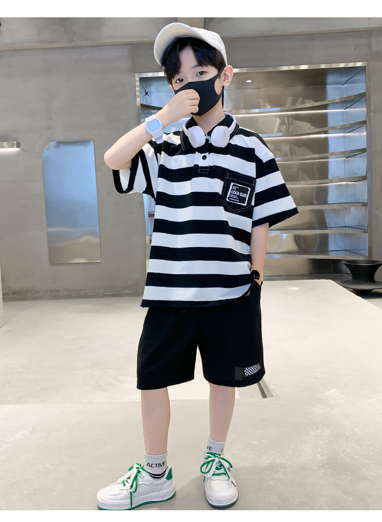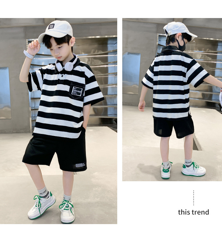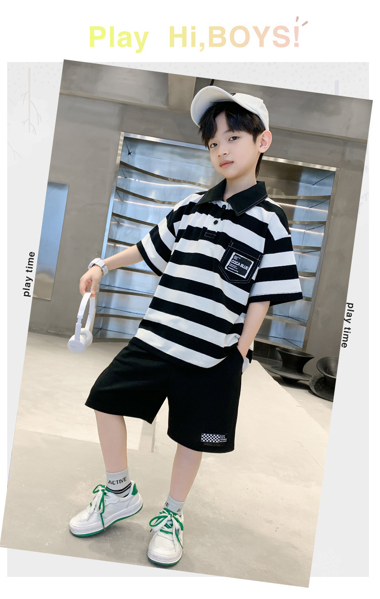 소년 여름 정장 스트라이프 폴로 셔츠 2022 새로운 반팔 어린이 여름 스포츠 투피스 세트 큰 어린이 유행스토어 가기