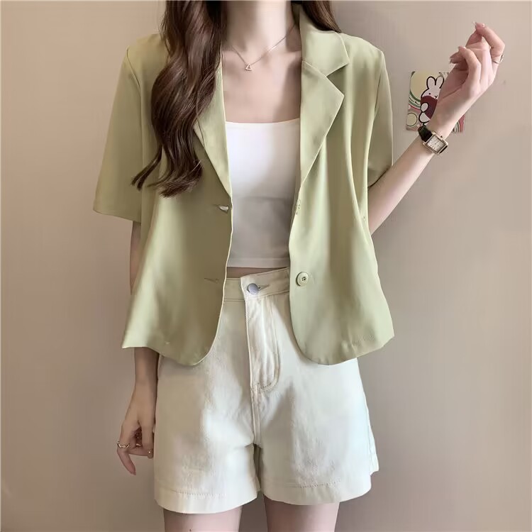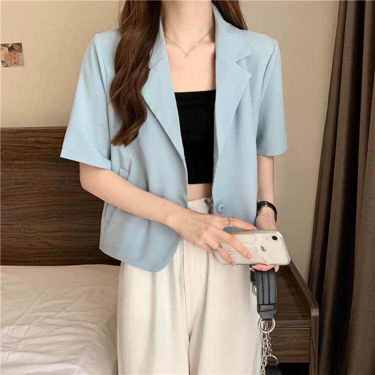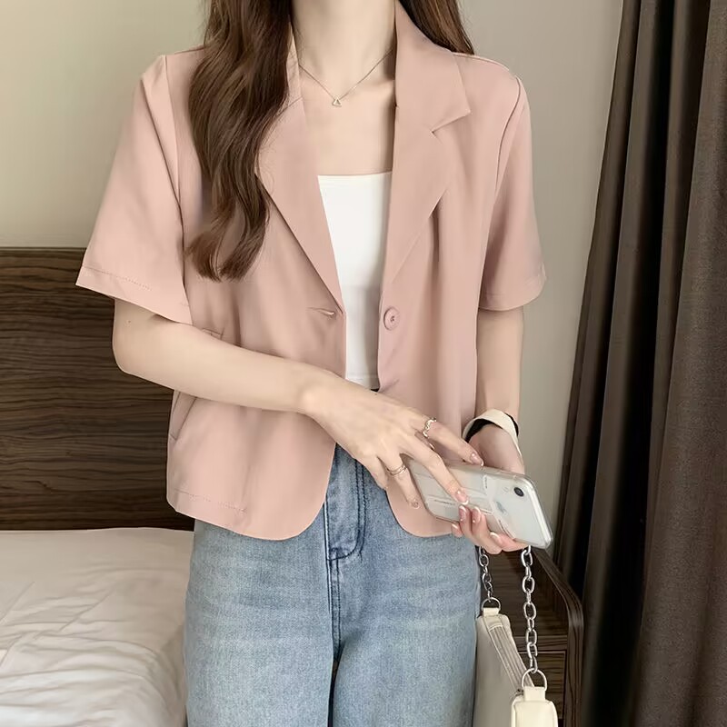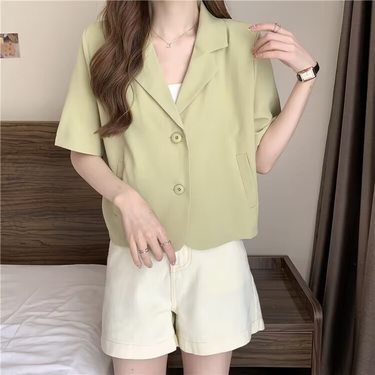 정장 칼라 반팔 셔츠 자켓 여성 여름 2023 새로운 디자인 틈새 얇은 셔츠 짧은 탑