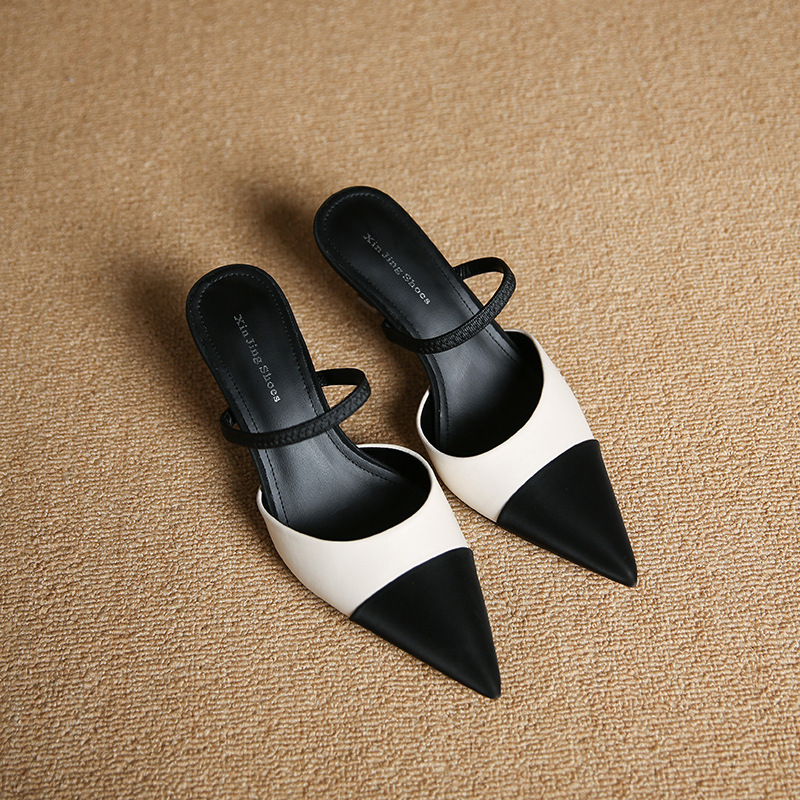 699-70 새로운 스타일 샤넬 스타일 컬러 매칭 뾰족한 발가락 하프 슬리퍼 여성용 샤오 마오 힐 신발과 빈 발가락 여행 샌들스토어 가기