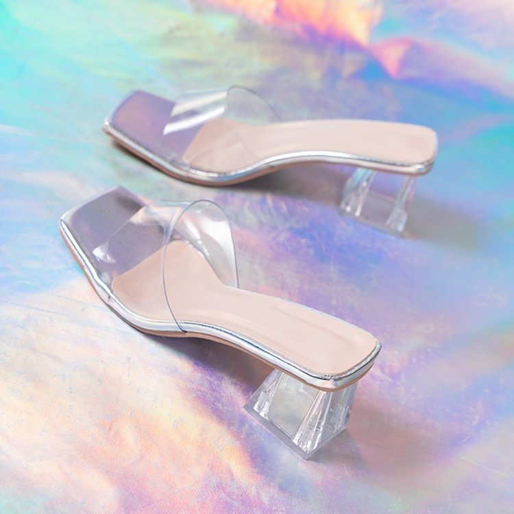 하이힐 여성용 2023 새로운 청키 힐 스퀘어 헤드 아우터 플러스 사이즈 슬리퍼 투명 슬리퍼