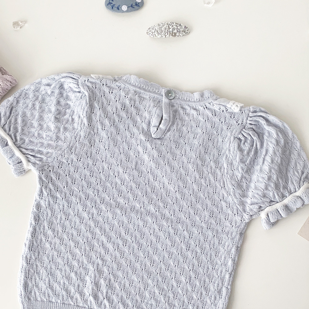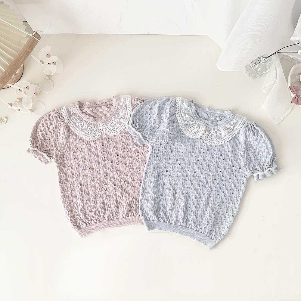 아기 소녀 풀오버 자수 칼라 중공 니트 스웨터 여자의 달콤한 얇은 귀여운 짧은 소매의 Cutemily 여름스토어 가기