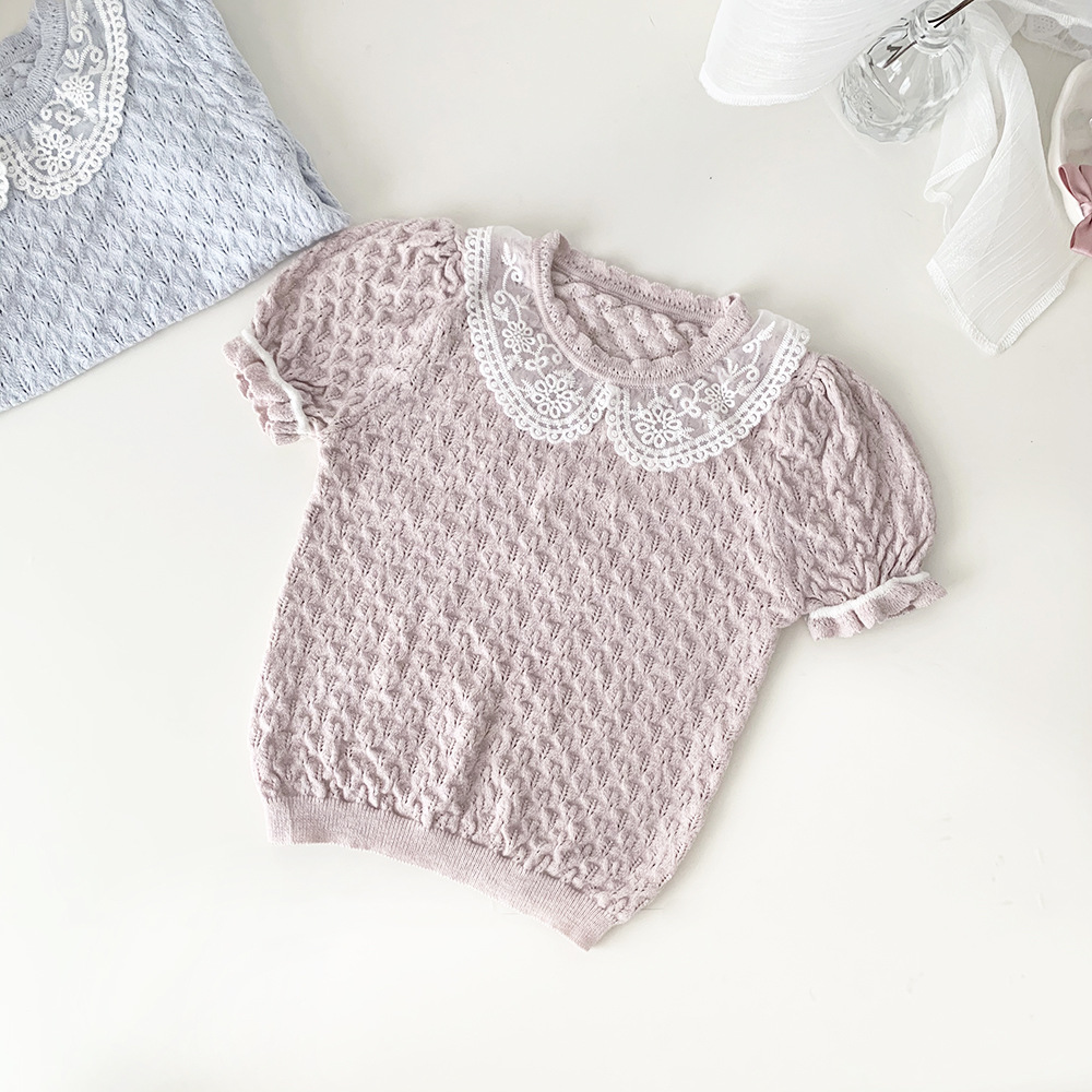 아기 소녀 풀오버 자수 칼라 중공 니트 스웨터 여자의 달콤한 얇은 귀여운 짧은 소매의 Cutemily 여름