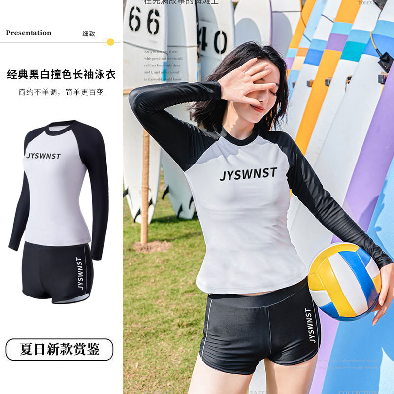Jisheng 수영복 여자의 보수적 인 분할 하이 엔드 수영 긴 소매 대비 색상 2023 새로운 자외선 차단제 다이빙 서핑 세트스토어 가기