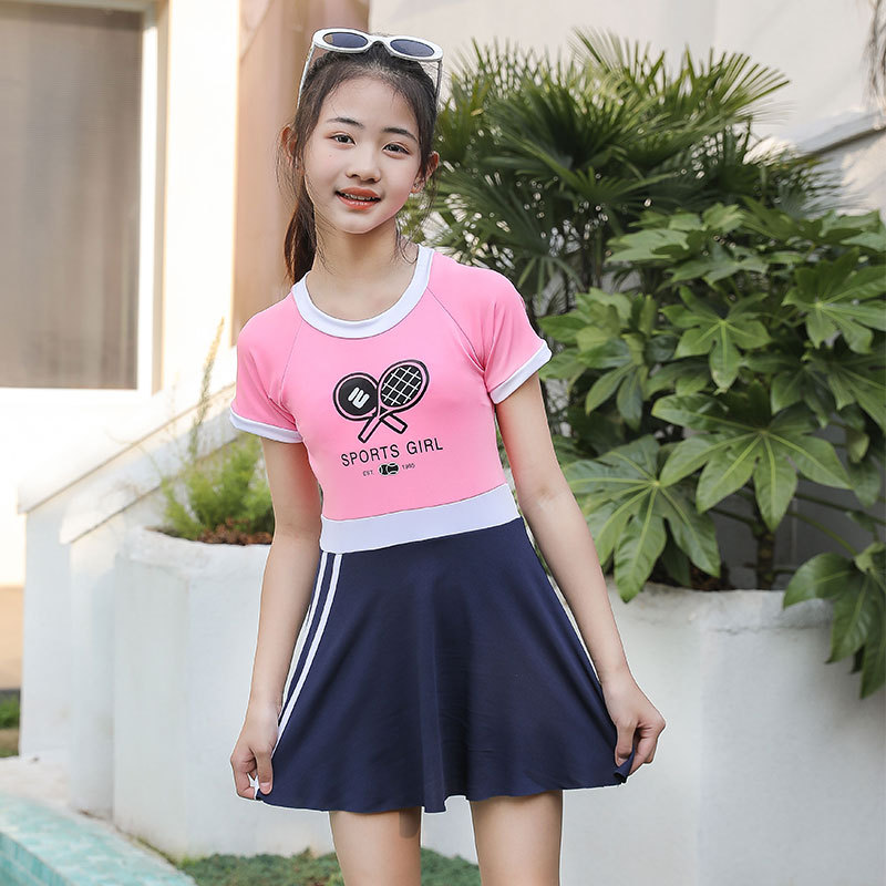 매우 어린 어린이 수영복 여아 원피스 프린트 반팔 큰 어린이 2023 새로운 스타일 여아 수영 자외선 차단제 전문 수영