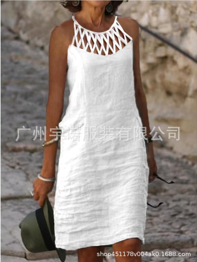 2023 유럽과 미국 여성 의류 아마존 폭발 독립 역 베스트 셀러 단색 여성용 면 및 린넨 캐주얼 슬링 원피스스토어 가기