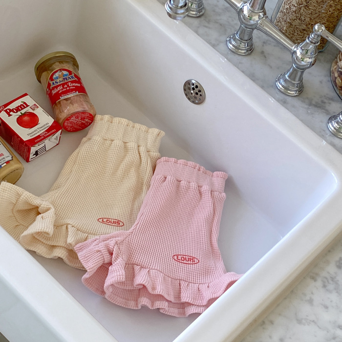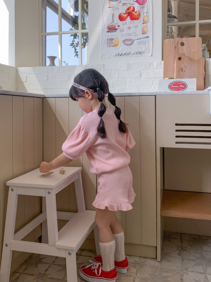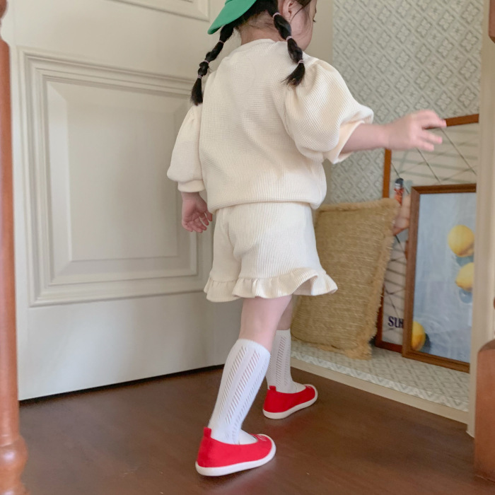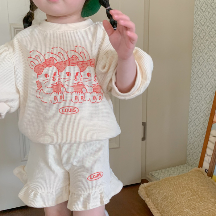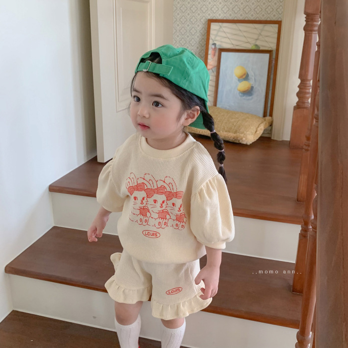여자 한국 스타일 여름 귀여운 토끼 와플 짧은 소매 세트 에 퍼프 슬리브 탑 레이스 반바지 유행스토어 가기