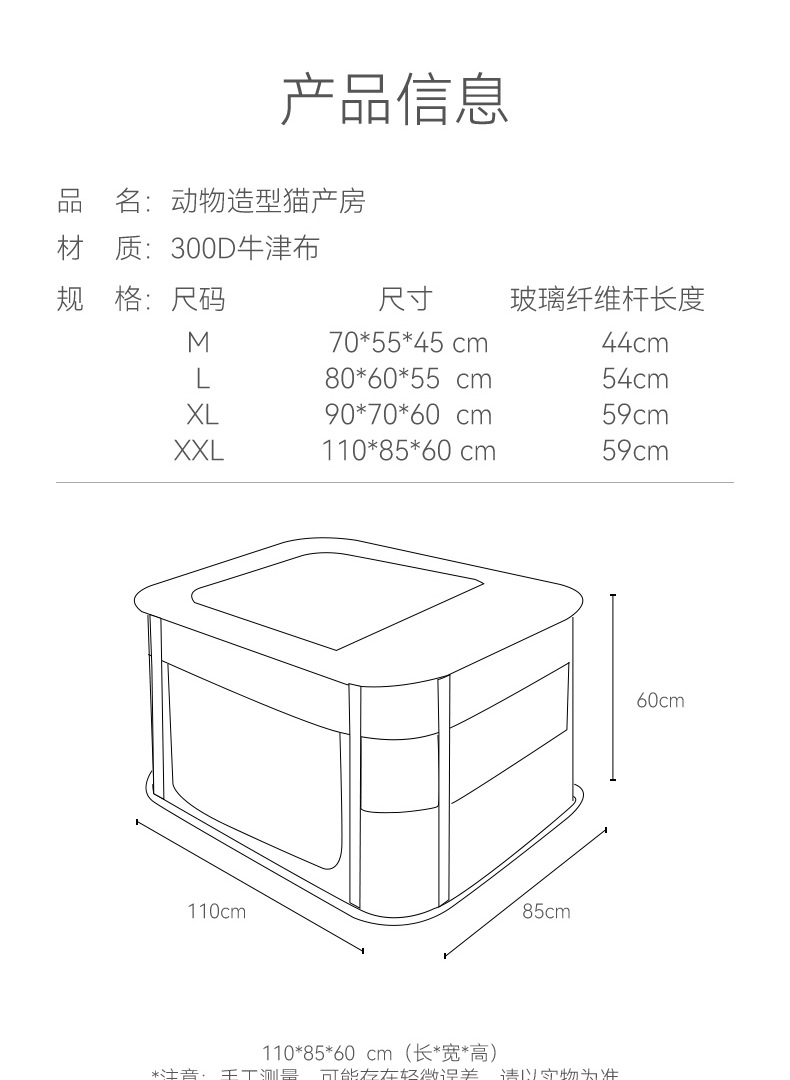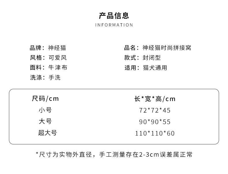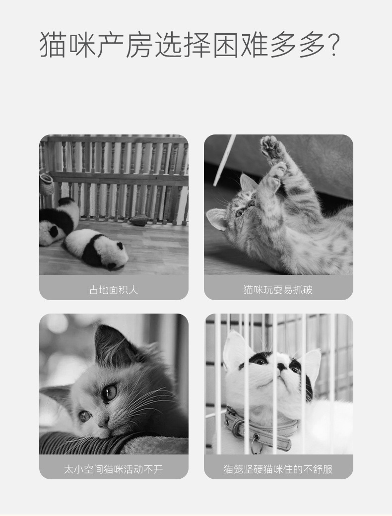 因猫产房是可折叠款式的,使用的框架材质为钢丝,收到猫产房打开后,会出现不立体的情况,类似高低不平的情况,这并不为质量问题,是工艺现象,扁钢丝接缝处朝内侧,会凹陷。只需要将猫产房,打开后,平铺,上方加稍重一点的东西,压一天,可恢复
